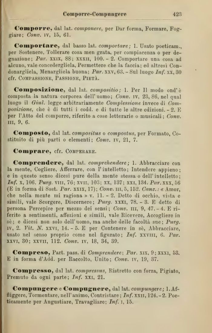 Comprendere, dal lat. comprehendere ; 1. Abbracciare con la mente, Cogliere, Afferrare, con l'intelletto; Intendere appieno; e in questo senso dicesi pure della mente stessa o dell'intelletto ; Inf. x, 106. Purg. vili, 76; xvn, 103; xx, 137; xxi, 134. Par.xxx, 56 (E in forma di Sost. Par. xxix, 17); Conv. in, 5,152. Cam.: « Amor, che nella mente mi ragiona » v. 11. - 2. Detto di occhio, vista e simili, vale Scorgere, Discernere; Purg. xxxi, 78.-3. E detto di persona Percepire per mezzo dei sensi; Conv. in, 9, 47.-4. E riferito a sentimenti, affezioni e simili, vale Ricevere, Accogliere in sč; e dicesi non solo dell'uomo, ma anche delle facoltą sue; Purg. iv, 2. Vit. N. xxvi, 14. - 5. E per Contenere in sč, Abbracciare, usato nel senso proprio come nel figurato ; Inf. xxvm, 6. Par. xxvi, 30; xxvii, 112. Conv. iv, 18, 34, 39.
