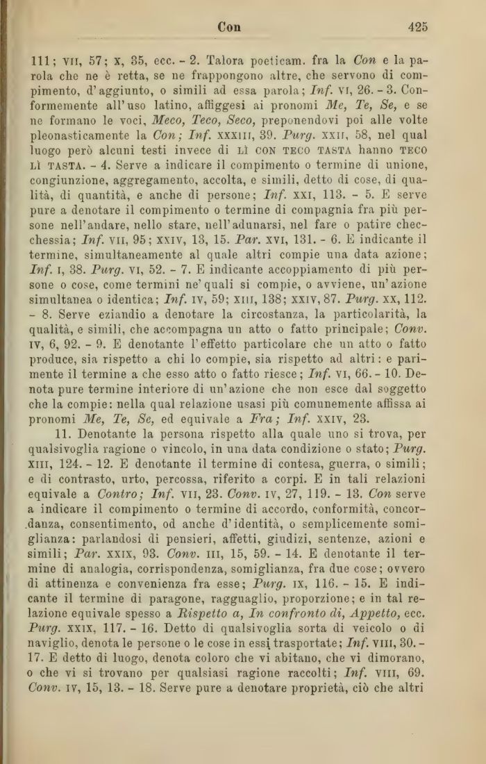 111; vii, 57; x, 35, ecc. - 2. Talora poeticam. fra la Con e la parola che ne è retta, se ne frappongono altre, che servono di compimento, d'aggiunto, o simili ad essa parola; Inf. VI, 26.-3. Conformemente all'uso latino, affiggesi ai pronomi Me, Te, Se, e se ne formano le voci, Meco, Teco, Seco, preponendovi poi alle volte pleonasticamente la Con; Inf. xxxiii, 39. Purg. xxii, 58, nel qual luogo però alcuni testi invece di lì con teco tasta hanno teco lì tasta. - 4. Serve a indicare il compimento o termine di unione, congiunzione, aggregamento, accolta, e simili, detto di cose, di qualità, di quantità, e anche di persone; Inf. xxi, 113. - 5. E serve pure a denotare il compimento o termine di compagnia fra più persone nell'andare, nello stare, nell'adunarsi, nel fare o patire checchessia; Inf. vii, 95; xxiv, 13, 15. Par. xvi, 131. - 6. E indicante il termine, simultaneamente al quale altri compie una data azione; Inf. i, 38. Purg. vi, 52. - 7. E indicante accoppiamento di più persone o cose, come termini ne'quali si compie, o avviene, un'azione simultanea o identica; Inf. iv, 59; xiii, 138; xxiv, 87. Purg. xx, 112. - 8. Serve eziandio a denotare la circostanza, la particolarità, la qualità, e simili, che accompagna un atto o fatto principale; Conv. iv, 6, 92. - 9. E denotante l'effetto particolare che un atto o fatto produce, sia rispetto a chi lo compie, sia rispetto ad altri : e parimente il termine a che esso atto o fatto riesce ; Inf. vi, 66. - 10. Denota pure termine interiore di un'azione che non esce dal soggetto che la compie: nella qual relazione usasi più comunemente affissa ai pronomi Me, Te, Se, ed equivale a Fra ; Inf. xxiv, 23.