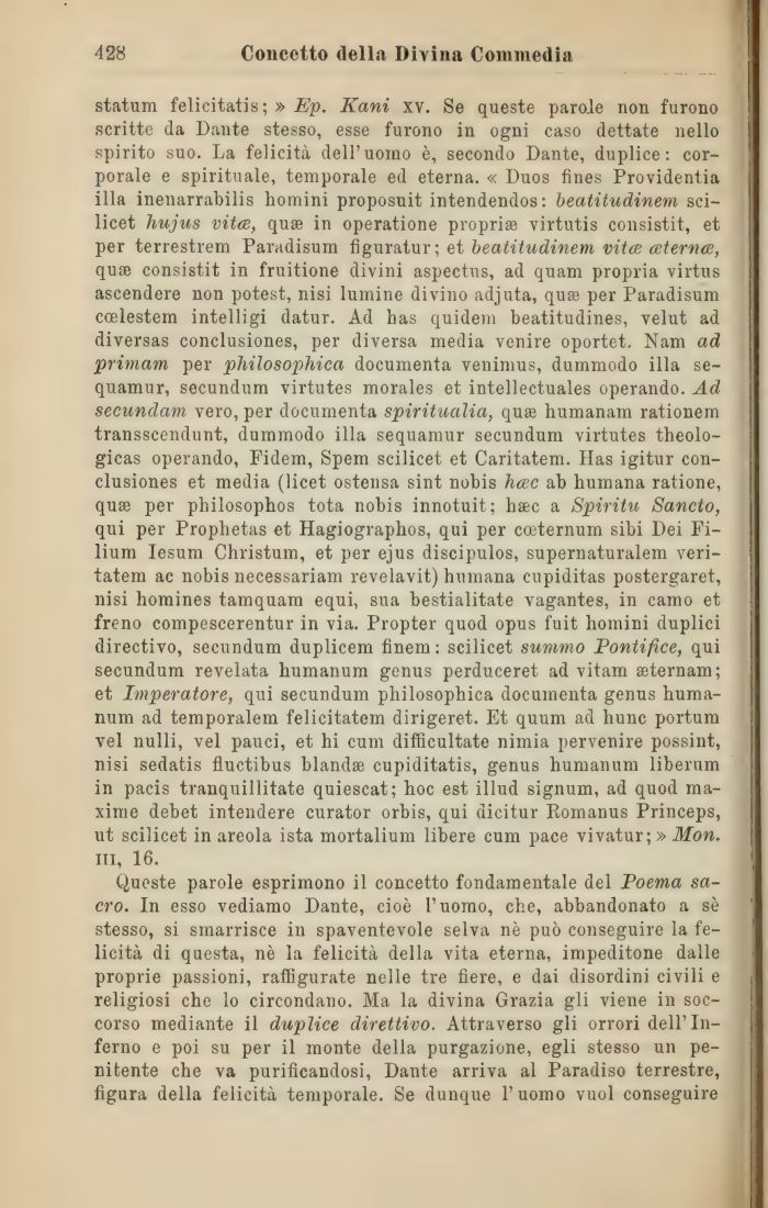statum felicitatis; » _E7p. Kani xv. Se queste parole non furono scritte da Dante stesso, esse furono in ogni caso dettate nello spirito suo. La felicitą dell'uomo č, secondo Dante, duplice: corporale e spirituale, temporale ed eterna. « Duos fines Providentia illa inenarrabilis homini proposuit intendendos: beatitudinem sci-licet hujus vita, quse in operatione propri» virtutis consistit, et per terrestrem Paradisum figuratur ; et beatitudinem vitce ceternce, qua; consistit in fruitione divini aspectus, ad quam propria virtus ascendere non potest, nisi lumine divino adjuta, quse per Paradisum ccelestem intelligi datur. Ad has quidem beatitudines, velut ad diversas conclusiones, per diversa media venire oportet. Nam ad prirnam per philosophica documenta venimus, dummodo illa se-quamur, secundum virtutes morales et intellectuales operando. Ad secundam vero, per documenta spiritualia, quee humanam rationem transscendunt, dummodo illa sequamur secundum virtutes theolo-gicas operando, Fidem, Spem scilicet et Caritatem. Has igitur conclusiones et media (licet osteusa sint nobis hcec ab bumana ratione, quse per philosophos tota nobis innotuit; haec a Spiritu Sancto, qui per Proplietas et Hagiographos, qui per coeternum sibi Dei Fi-lium Iesum Christum, et per ejus discipulos, supernaturalem veri-tatem ac nobis necessariam revelavit) humana cupiditas postergaret, nisi homines tamquam equi, sua bestialitate vagantes, in camo et freno compescerentur in via. Propter quod opus fuit homini duplici directivo, secundum duplicem flnem : scilicet summo Ponti/ice, qui secundum revelata humanum genus perduceret ad vitam seternam; et Imperatore, qui secundum philosophica documenta genus humanum ad temporalem felicitatem dirigeret. Et quum ad hunc portum vel nulli, vel pauci, et hi cum difficultate nimia pervenire possint, nisi sedatis fluctibus blandse cupiditatis, genus humanum liberum in pacis tranquillitate quiescat; hoc est illud signum, ad quod maxime debet intendere curator orbis, qui dicitur Romanus Princeps, ut scilicet in areola ista mortalium libere cum pace vivatur; » Moti. ili, 16.