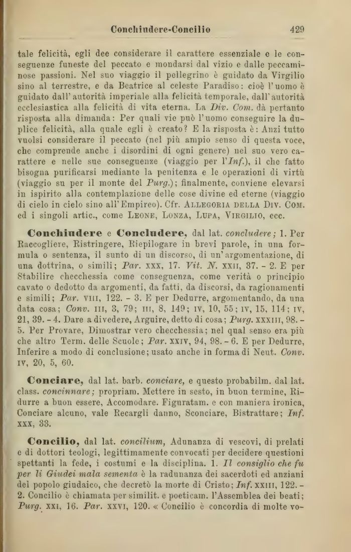 Concliindere e Concludere, dal lat. concludere; 1. Per Raccogliere, Ristringere, Riepilogare in brevi parole, in una formula o sentenza, il sunto di un discorso, di un'argomentazione, di una dottrina, o simili; Par. xxx, 17. Vit. N. xxn, 37. - 2. E per Stabilire checchessia come conseguenza, come verità o principio cavato o dedotto da argomenti, da fatti, da discorsi, da ragionamenti e simili; Par. vili, 122. - 3. E per Dedurre, argomentando, da una data cosa; Conv. in, 3, 79; ih, 8, 149; iv, 10, 55; iv, 15, 114; iv, 21, 39. - 4. Dare a divedere, Arguire, detto di cosa; Purg. xxxin, 98. -5. Per Provare, Dimostrar vero checchessia; nel qual senso era più che altro Term. delle Scuole; Par. xxiv, 94, 98.-6. E per Dedurre, Inferire a modo di conclusione; usato anche in forma di Neut. Conv. iv, 20, 5, 60.