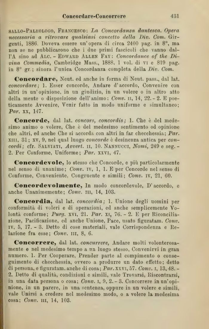 sallo-Paleologo, Francesco: La Concordanza dantesca. Opera necessaria a ritrovare qualsiasi concetto della Div. Com. Gir-genti, 1886. Doveva essere un'opera di circa 2400 pag. in 8°, ma non se ne pubblicarono che i due primi fascicoli che vanno dall'A sino ad Alc. - Edward Allen Fay : Concordance of the Divina Commedia, Cambridge Mass., 1888, 1 voi. di vi e 819 pag. in 8° gi\; sinora l'unica Concordanza completa della Div. Com.