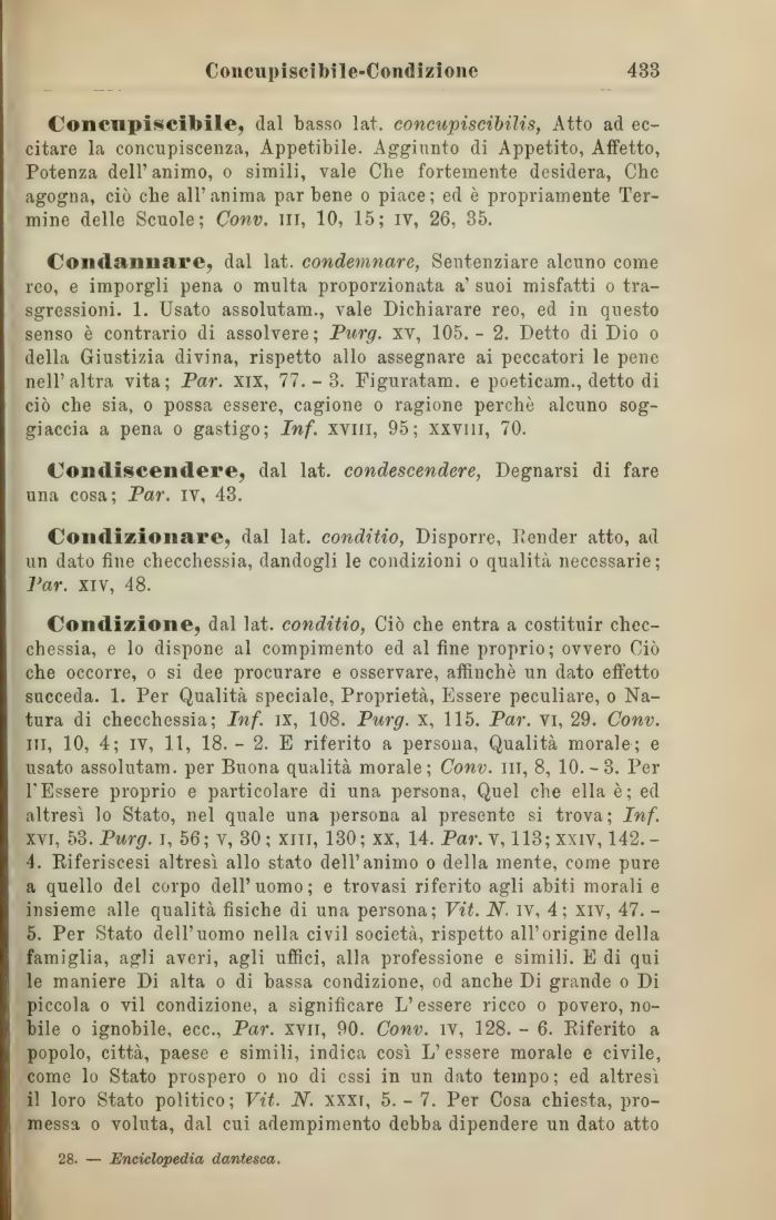 Condizione, dal lat. conditio, Ciò che entra a costituir checchessia, e lo dispone al compimento ed al fine proprio; ovvero Ciò che occorre, o si dee procurare e osservare, affinchè un dato effetto succeda. 1. Per Qualità speciale, Proprietà, Essere peculiare, o Natura di checchessia; Inf. ix, 108. Purg. x, 115. Par. vi, 29. Conv. in, 10, 4; iv, 11, 18. - 2. E riferito a persona, Qualità morale ; e usato assolutam. per Buona qualità morale; Conv. in, 8, 10.-3. Per l'Essere proprio e particolare di una persona, Quel che ella è; ed altresì lo Stato, nel quale una persona al presente si trova; Inf. xvi, 53. Purg. i, 56; v, 30 ; xin, 130; xx, 14. Par. v, 113; xxiv, 142. -