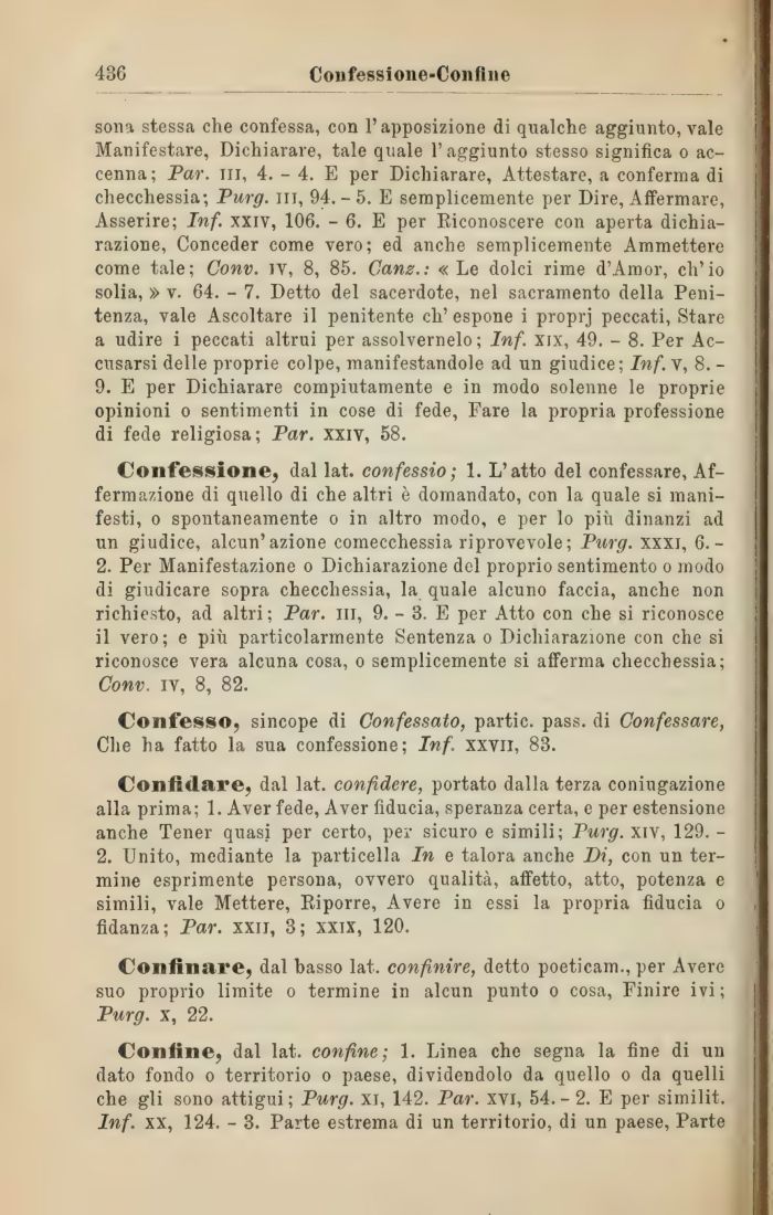 sona stessa che confessa, con l'apposizione di qualche aggiunto, vale Manifestare, Dichiarare, tale quale l'aggiunto stesso significa o accenna; Par. in, 4. - 4. E per Dichiarare, Attestare, a conferma di checchessia; Purg. in, 94. - 5. E semplicemente per Dire, Affermare, Asserire; Inf. xxiv, 106. - 6. E per Riconoscere con aperta dichiarazione, Conceder come vero; ed anche semplicemente Ammettere come tale; Conv. iv, 8, 85. Cane.: «Le dolci rime d'Amor, ch'io solia, » v. 64. - 7. Detto del sacerdote, nel sacramento della Penitenza, vale Ascoltare il penitente eh' espone i proprj peccati, Stare a udire i peccati altrui per assolvernelo ; Inf. xix, 49. - 8. Per Accusarsi delle proprie colpe, manifestandole ad un giudice; Inf. v, 8.-9. E per Dichiarare compiutamente e in modo solenne le proprie opinioni o sentimenti in cose di fede, Fare la propria professione di fede religiosa; Par. xxiv, 58.