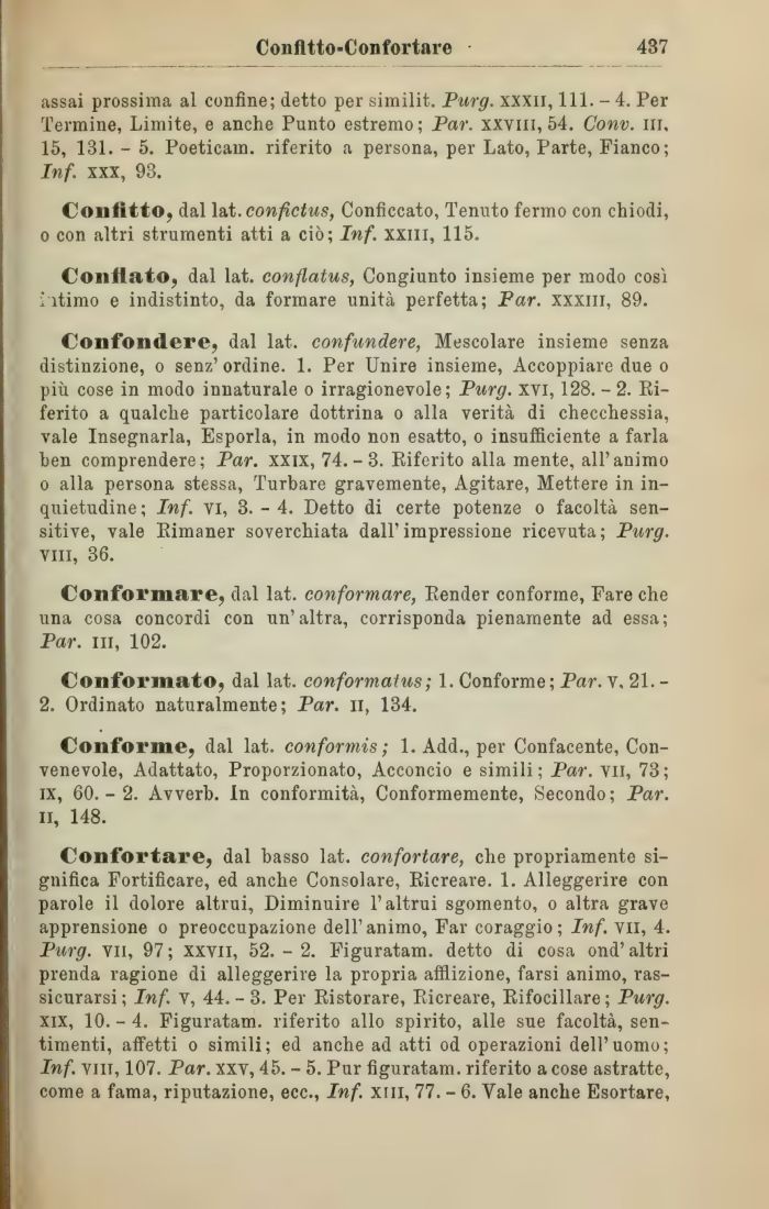 Confortare, dal basso lat. confortare, che propriamente significa Fortificare, ed anche Consolare, Ricreare. 1. Alleggerire con parole il dolore altrui, Diminuire l'altrui sgomento, o altra grave apprensione o preoccupazione dell'animo, Far coraggio; Inf. vii, 4. Purg. vii, 97 ; xxvn, 52. - 2. Figuratam. detto di cosa ond' altri prenda ragione di alleggerire la propria afflizione, farsi animo, rassicurarsi; Inf. v, 44. - 3. Per Ristorare, Ricreare, Rifocillare; Purg. xix, 10. - 4. Figuratam. riferito allo spirito, alle sue facoltà, sentimenti, affetti o simili; ed anche ad atti od operazioni dell'uomo; Inf. vili, 107. Par. xxv, 45. - 5. Pur figuratam. riferito a cose astratte, come a fama, riputazione, ecc., Inf. xni, 77. - 6. Yale anche Esortare,