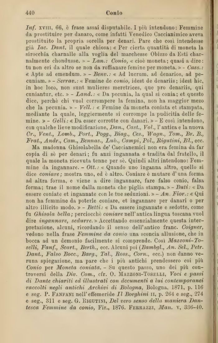 Inf. xvm, 66, è frase assai disputabile. I più intendono: Femmine da prostituire per danaro, come infatti Yenedico Caccianimico aveva prostituito la propria sorella per denari. Pare che così intendesse già Iac. Dant. il quale chiosa : « Per cierta quantità di moneta la sirocchia charnalle alla voglia del marchesse Obizzo da Esti char-nalmente chondusse. » - Lan.: Conio, « cioè moneta; quasi a dire: tu non eri da altro se non da roffianare femine per moneta. » - Cass.: « Apte ad emendum. » - Benv.: « Ad lucrum, ad denarios, ad pe-cuniam. » - Serrav.: « Femine de conio, idest de denariis ; idest hic, in hoc loco, non sunt mulieres meretrices, que prò denariis, qui cuniantur, etc. » - Land.: « Da pecunia, la qual si conia; et questo dice, perchè chi vuol corrompere la femina, non ha maggior mezo che la pecunia. » - Vell. : « Femine da moneta coniata et stampata, mediante la quale, leggiermente si corrompe la pudicitia delle femine. » - Gelli: « Da esser corrotte con danari. » - E così intendono, con qualche lieve modificazione, Dan., Cast., Voi., l'antica e la nuova Cr., Vent., Lomb., Port., Pogg., Biag., Ces., Wagn., Tom., Br. B., Frat., Andr., Cam., Bennas., Lub., Campi, Poi., Bigutini, Bl., ecc.