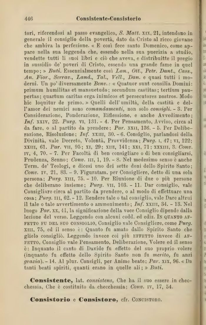tori, riferendosi al passo evangelico, S. Matt. xix, 21, intendono in generale il consiglio della povertà, dato da Cristo al ricco giovane che ambiva la perfezione. « E così fece santo Domenico, come appare nella sua leggenda che, essendo nella sua puerizia a studio, vendette tutti li suoi libri e ciò che aveva, e distribuitte il pregio in sussidio de' poveri di Cristo, essendo una grande fame in quel tempo; » Buti. Essenzialmente così Lati., Ott., Petr. Dant., Cass., An. Fior., Serrav., Land., Tal., Veli-, Dan. e quasi tutti i moderni. Un po' diversamente Benv.: « Quatuor sunt Consilia Domini: primum humilitas et mansuetudo; secundum castitas; tertium pau-pertas; quartum caritas erga inimicos et persecutores nostros. Modo hic loquitur de primo. » Quelli dell'umiltà, della castità e dell'amor dei nemici sono comandamenti, non solo consigli. - 3. Per Considerazione, Ponderazione, Riflessione, e anche Avvedimento; Inf. xxiv, 22. Purg. vi, 131. - 4. Per Pensamento, Avviso, circa al da fare, o al partito da prendere ; Par. xxn, 136. - 5. Per Deliberazione, Risoluzione; Inf. xxm, 30.-6. Consiglio, parlandosi della Divinità, vale Decreto, Volontà, Provvidenza; Purg. i, 47; vi, 122; xxm, 61. Par. vii, 95; xi, 29; xm, 141; xxi, 71; xxxiti, 3. Conv. iv, 4, 70. - 7. Per Facoltà di ben consigliare o di ben consigliarsi, Prudenza, Senno; Conv. ni, 1, 19. - 8. Nel medesimo senso è anche Term. de' Teologi, e dicesi uno dei sette doni dello Spirito Santo; Conv. ìv, 21, 83. - 9. Figuratam. per Consigliere, detto di una sola persona; Purg. xiii, 75. - 10. Per Riunione di due o più persone che deliberano insieme; Purg. vii, 103.- 11. Dar consiglio, vale Consigliare circa al partito da prendere, o al modo di effettuare una cosa; Purg. in, 62. - 12. Rendere tale o tal consiglio, vale Dare altrui il tale o tale avvertimento o ammonimento; Inf. xxiit, 34. - 13. Nel luogo Par. xx, 41, la significazione della voce Consiglio dipende dalla lezione del verso. Leggendo con alcuni codd. ed ediz. In quanto affetto fu del suo consiglio, Consiglio vale Consigliere, come Purg. Xiii, 75, ed il senso ò: Quanto fu amato dallo Spirito Santo che glielo consigliò. Leggendo invece coi più effetto invece di affetto, Consiglio vale Pensamento, Deliberazione, Volere ed il senso è: Inquanto il canto di Davide fu effetto del suo proprio volere (inquanto fu effetto dello Spirito Santo non fu merito, fu anzi grazia). - 14. Al plur. Consigli, per Anime beate; Par. xix, 96. « Da tanti beati spiriti, quanti erano in quelle ali; » Buti.