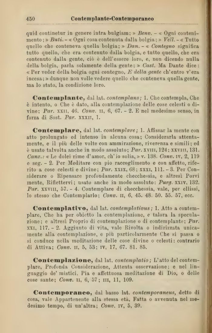 Contemplare, dal lat. contemplare ; 1. Affissar la mente con atto prolungato ed intenso in alcuna cosa; Considerarla attentamente, e il più delle volte con ammirazione, riverenza e simili; ed è usato talvolta anche in modo assoluto; Par. xviii, 124; xxviii, 131. Canz.: «Le dolci rime d'amor, ch'io solia, » v. 138. Conv. iv, 2, 119 e seg. - 2. Per Meditare con pio raccoglimento e con affetto, riferito a cose celesti e divine; Par. xxix, 68; xxxi, 111.-3. Per Considerare o Ripensare profondamente checchessia, e altresì Porvi mente, Riflettervi; usato anche in modo assoluto: Purg. xxiv, 132. Par. xxviii, 57. - 4. Contemplare di checchessia, vale, per ellissi, lo stesso che Contemplarlo; Conv. il, 6, 45. 48. 50. 55. 57, ecc.