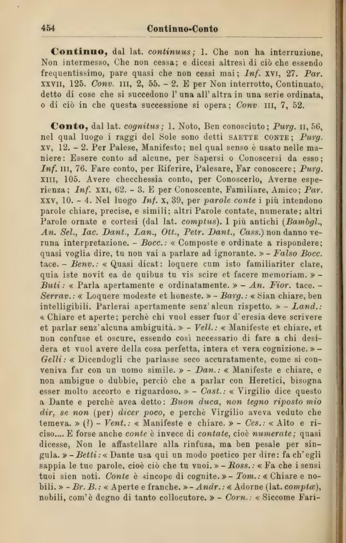 Conto, dal lat. cognitus ; 1. Noto, Ben conosciuto; Purg. n, 56, nel qual luogo i raggi del Sole sono detti saette conte; Purg. xv, 12. - 2. Per Palese, Manifesto; nel qual senso è usato nelle maniere: Essere conto ad alcune, per Sapersi o Conoscersi da esso; Inf. in, 76. Fare conto, per Riferire, Palesare, Far conoscere; Purg. xiii, 105. Avere checchessia conto, per Conoscerlo, Averne esperienza; Inf. xxi, 62. - 3. E per Conoscente, Familiare, Amico; Par. xxv, 10. - 4. Nel luogo Inf. x, 39, per parole conte i più intendono parole chiare, precise, e simili; altri Parole contate, numerate; altri Parole ornate e cortesi (dal lat. comptus). I più antichi (Bambgl An. Sei., Iac. Dant., Lan., Ott., Petr. Dant., Cass.) non danno veruna interpretazione. - Bocc.: « Composte e ordinate a rispondere; quasi voglia dire, tu non vai a parlare ad ignorante. » - Falso Bocc. tace. - Benv.: « Quasi dicat: loquere cum isto familiariter dare, quia iste novit ea de quibus tu vis scire et facere memoriam. » -Buti: « Parla apertamente e ordinatamente. » - An. Fior. tace. -Serrav.: « Loquere modeste et honeste. » - Barg. : « Sian chiare, ben intelligibili. Parlerai apertamente senz' alcun rispetto. » - Land.: «. Chiare et aperte; perchè chi vuol esser fuor d'eresia deve scrivere et parlar senz'alcuna ambiguità. » - Veli. : « Manifeste et chiare, et non confuse et oscure, essendo così necessario di fare a chi desidera et vuol avere della cosa perfetta, intera et vera cognizione. »-Gelli : « Dicendogli che parlasse seco accuratamente, come si conveniva far con un uomo simile. » - Dan.: « Manifeste e chiare, e non ambigue o dubbie, perciò che a parlar con Heretici, bisogna esser molto accorto e riguardoso. » - Cast.: « Virgilio dice questo a Dante e perchè avea detto : Buon duca, non tegno riposto mio dir, se non (per) dicer poco, e perchè Virgilio aveva veduto che temeva. » (?) - Vent. : « Manifeste e chiare. » - Ces.: « Alto e ri-ciso.... E forse anche conte è invece di contate, cioè numerate; quasi dicesse, Non le affastellare alla rinfusa, ma ben pesale per sin-gula. » - Betti : « Dante usa qui un modo poetico per dire: fa ch'egli sappia le tue parole, cioè ciò che tu vuoi. » - Boss.: « Fa che i sensi tuoi sien noti. Conte è sincope di cognite.» - Tom.: « Chiare e nobili. » - Br. B. : « Aperte e franche. »-Andr.: « Adorne (lat. comptce), nobili, com'è degno di tanto collocutore. » - Com.: « Siccome Fari-
