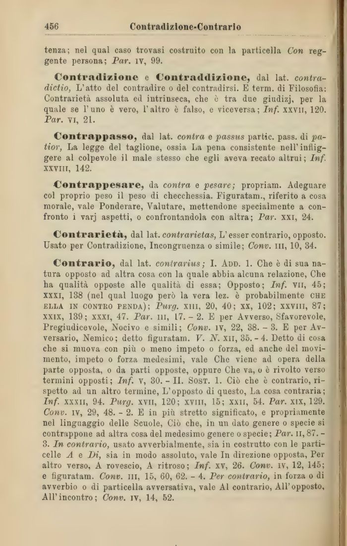 Contrario, dal lat. contrarius ; I. Add. 1. Che è di sua natura opposto ad altra cosa con la quale abbia alcuna relazione, Che ha qualità opposte alle qualità di essa; Opposto; Inf. vii, 45; xxxi, 138 (nel qual luogo però la vera lez. è probabilmente che ella in contro penda); Purg. xiii, 20, 40; xx, 102; xxviii, 87;