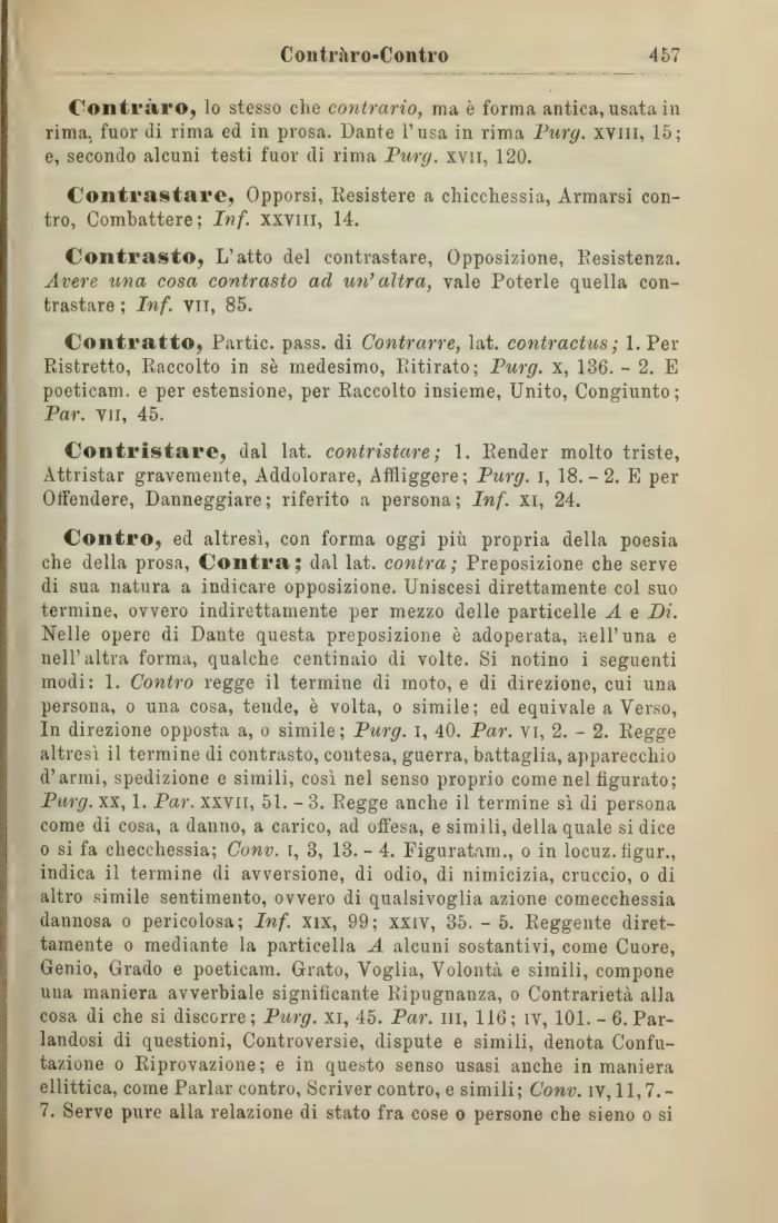 Contro, ed altresė, con forma oggi pių propria della poesia che della prosa, Contra; dal lat. contra ; Preposizione che serve di sua natura a indicare opposizione. Uniscesi direttamente col suo termine, ovvero indirettamente per mezzo delle particelle A e Di. Nelle opere di Dante questa preposizione č adoperata, nell'una e nell'altra forma, qualche centinaio di volte. Si notino i seguenti modi: 1. Contro regge il termine di moto, e di direzione, cui una persona, o una cosa, tende, č volta, o simile; ed equivale a Verso, In direzione opposta a, o simile; Purg. i, 40. Par. vi, 2. - 2. Regge altresė il termine di contrasto, contesa, guerra, battaglia, apparecchio d'armi, spedizione e simili, cosė nel senso proprio come nel figurato; Purg. xx, 1. Par. xxvn, 51. - 3. Regge anche il termine sė di persona come di cosa, a danno, a carico, ad offesa, e simili, della quale si dice o si fa checchessia; Conv. i, 3, 13. - 4. Figuratane, o in locuz. figur., indica il termine di avversione, di odio, di nimicizia, cruccio, o di altro simile sentimento, ovvero di qualsivoglia azione comecchessia dannosa o pericolosa; Inf. xix, 99; xxiv, 35. - 5. Reggente direttamente o mediante la particella A alcuni sostantivi, come Cuore, Genio, Grado e poeticam. Grato, Voglia, Volontā e simili, compone una maniera avverbiale significante Ripugnanza, o Contrarietā alla cosa di che si discorre; Purg. xi, 45. Par. ili, 116; ėv, 101. - 6. Parlandosi di questioni, Controversie, dispute e simili, denota Confutazione o Riprovazione; e in questo senso usasi anche in maniera ellittica, come Parlar contro, Scriver contro, e simili; Conv. iv, 11,7.-7. Serve pure alla relazione di stato fra cose o persone che sieno o si