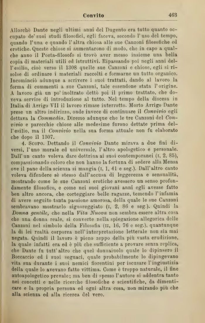 4. Scopo. Dettando il Convivio Dante mirava a due fini diversi, l'uno morale ed universale, l'altro apologetico e personale. Dall'un canto voleva dare dottrina ai suoi contemporanei (i, 2, 85), compassionaudo coloro che non hanno la fortuna di sedere alla Mensa ove il pane della scienza si mangia (i, 1, 41 e seg.). Dall'altro canto voleva difendere sè stesso dall'accusa di leggerezza e sensualità, mostrando come le sue Canzoni erotiche avessero un senso profondamente filosofico, e come nei suoi giovani anni egli avesse fatto ben altro ancora, che corteggiare belle ragazze, temendo l'infamia di avere seguito tanta passione amorosa, della quale le sue Canzoni sembravano mostrarlo signoreggiato (i, 2, 86 e seg). Quindi la Donna gentile, che nella Vita Nuova non sembra essere altra cosa che una donna reale, si converte nella spiegazione allegorica delle Canzoni nel simbolo della Filosofia (il, 16, 76 e seg.), quantunque la di lei realtà corporea nell'interpretazione letterale non sia mai negata. Quindi il lavoro è pieno zeppo della più vasta erudizione, la quale infatti era ed è più che sufficiente a provare senza replica, che Dante fu tutt' altro che quel donnaiuolo quale lo dipinsero il Boccaccio ed i suoi seguaci, quale probabilmente lo dipingevano vita sua durante i suoi nemici fiorentini per iscusare l'ingiustizia della quale lo avevano fatto vittima. Come è troppo naturale, il fine autoapologetico prevale; ma ben di spesso l'autore si addentra tanto nei concetti e nelle ricerche filosofiche e scientifiche, da dimenticare e la propria persona ed ogni altra cosa, non mirando più che alla scienza ed alla ricerca del vero.