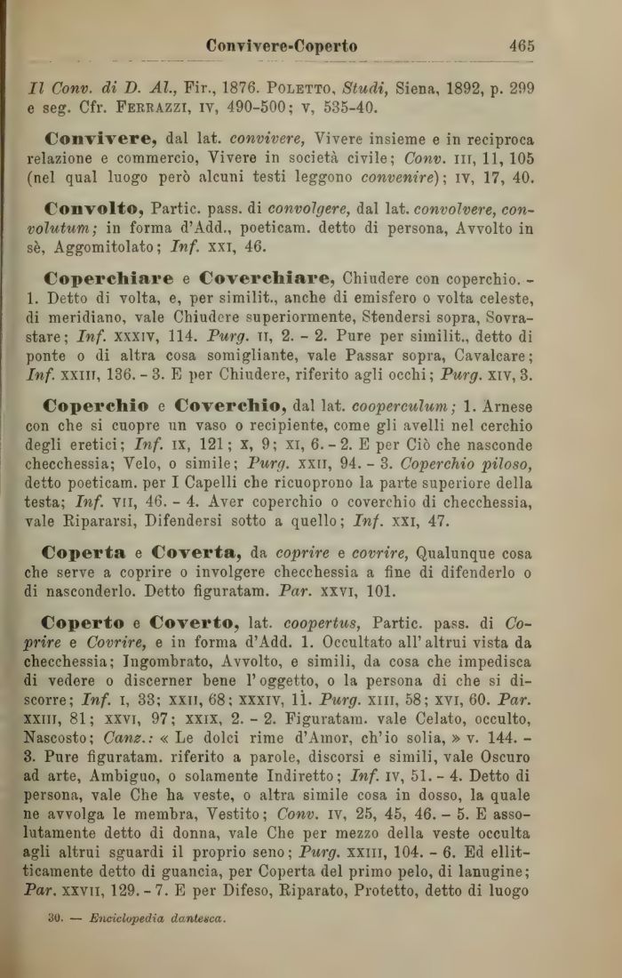 Coperto e Coverto, lat. coopertus, Partic. pass, di Coprire e Covrire, e in forma d'Add. 1. Occultato all'altrui vista da checchessia; Ingombrato, Avvolto, e simili, da cosa che impedisca di vedere o discerner bene l'oggetto, o la persona di che si discorre; Inf. i, 33; xxii, 68; xxxiv, lì. Purg. xiii, 58; xvi, 60. Par. xxiii, 81; xxvi, 97; xxix, 2.-2. Figuratam. vale Celato, occulto, Nascosto; Cam.: « Le dolci rime d'Amor, ch'io solia, » v. 144. -3. Pure figuratam. riferito a parole, discorsi e simili, vale Oscuro ad arte, Ambiguo, o solamente Indiretto; Inf. iv, 51.- 4. Detto di persona, vale Che ha veste, o altra simile cosa in dosso, la quale ne avvolga le membra, Vestito; Conv. iv, 25, 45, 46.- 5. E assolutamente detto di donna, vale Che per mezzo della veste occulta agli altrui sguardi il proprio seno; Purg. xxiii, 104. - 6. Ed ellitticamente detto di guancia, per Coperta del primo pelo, di lanugine; Par. xxvii, 129.-7. E per Difeso, Riparato, Protetto, detto di luogo