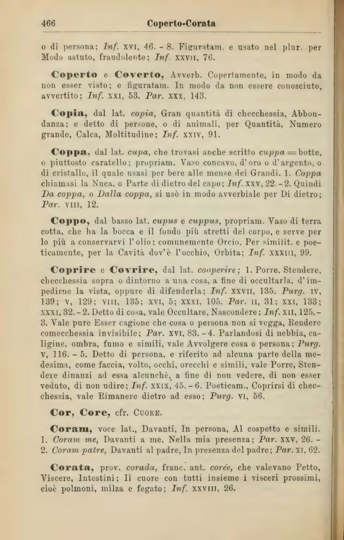 Coprire e Covrire, dal lat. cooperire; 1. Porre, Stendere, checchessia sopra o dintorno a una cosa, a fine di occultarla, d'impedirne la vista, oppure di difenderla; Inf. xxvil, 135. Purg. iv, 139; v, 129; vili, 135; XVI, 5; xxxi, 105. Par. li, 31; xxi, 133; xxxi, 32. - 2. Detto di cosa, vale Occultare, Nascondere ; Inf. xn, 125. -3. Vale pure Esser cagione che cosa o persona non si vegga, Rendere comecchessia invisibile; Par. xvi, 83.-4. Parlandosi di nebbia, caligine, ombra, fumo e simili, vale Avvolgere cosa o persona; Purg. V, 116. - 5. Detto di persona, e riferito ad alcuna parte della medesima, come faccia, volto, occhi, orecchi e simili, vale Porre, Stendere dinanzi ad essa alcunché,, a fine di non vedere, di non esser veduto, di non udire; Inf. xxix, 45.-6. Poeticam., Coprirsi di checchessia, vale Rimanere dietro ad esso; Purg. vi, 56.