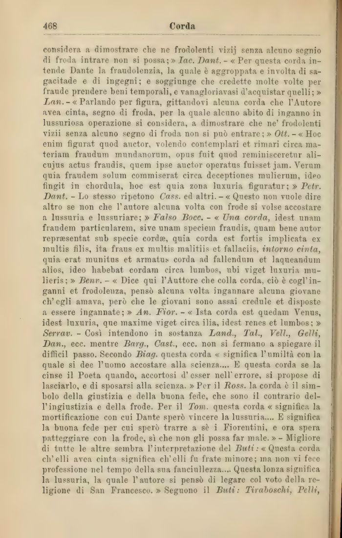 considera a dimostrare che ne frodolenti vizij senza alcuno segnio di froda intrare non si possa; » Iac. Dani. -« Per questa corda intende Dante la fraudolenzia, la quale è aggroppata e involta di sa-gacitade e di ingegni; e soggiunge che credette molte volte per fraude prendere beni temporali, e vanagloriavasi d'acquistar quelli; » Lan.-« Parlando per figura, gittandovi alcuna corda che l'Autore avea cinta, segno di froda, per la quale alcuno abito di inganno in lussuriosa operazione si considera, a dimostrare che ne' frodolenti vizii senza alcuno segno di froda non si può entrare;» Ott. -«Hoc enim figurat quod auctor, volendo contemplari et rimari circa ma-teriam fraudum mundanorum, opus fuit quod reminisceretur ali-cujus actus fraudis, quem ipse auctor operatus fuisset jam. Verum quia fraudem solum commiserat circa deceptiones mulierum, ideo fingit in chordula, hoc est quia zona luxuria figuratur; » Petr. Dani. - Lo stesso ripetono Cass. ed altri.-« Questo non vuole dire altro se non che l'autore alcuna volta con frode si volse accostare a lussuria e lussuriare; » Falso Bocc. - « Una corda, idest unam fraudem particularem, sive unam speciem fraudis, quam bene autor reprsesentat sub specie cordse, quia corda est fortis implicata ex multis filis, ita fraus ex multis malitiis et fallaciis, intorno cinta, quia erat munitus et armatus corda ad fallendum et laqueandum alios, ideo habebat cordam circa lumbos, ubi viget luxuria mu-lieris; » Benv. - « Dice qui l'Auttore che colla corda, ciò è cogl'inganni et frodolenza, pensò alcuna volta ingannare alcuna giovane ch'egli amava, però che le giovani sono assai credule et disposte a essere ingannate; » An. Fior. - « Ista corda est quedam Yenus, idest luxuria, que maxime viget circa ilia, idest renes et lumbos; » Serrav. - Così intendono in sostanza Land., Tal., Veli., Gelli, Dan., ecc. mentre Barg., Cast., ecc. non si fermano a spiegare il diffidi passo. Secondo Biag. questa corda « significa l'umiltà con la quale si dee l'uomo accostare alla scienza.... E questa corda se la cinse il Poeta quando, accortosi d'esser nell'errore, si propose di lasciarlo, e di sposarsi alla scienza. » Per il Boss, la corda è il simbolo della giustizia e della buona fede, che sono il contrario dell'ingiustizia e della frode. Per il Tom. questa corda « significa la mortificazione con cui Dante sperò vincere la lussuria.... E significa la buona fede per cui sperò trarre a sè i Fiorentini, e ora spera patteggiare con la frode, sì che non gli possa far male. »- Migliore di tutte le altre sembra l'interpretazione del Buti : « Questa corda ch'elli avea cinta significa ch'elli fu frate minore; ma non vi fece professione nel tempo della sua fanciullezza.... Questa lonza significa la lussuria, la quale l'autore si pensò di legare col voto della religione di San Francesco. » Seguono il Buti: Tiraboschi, Pelli,