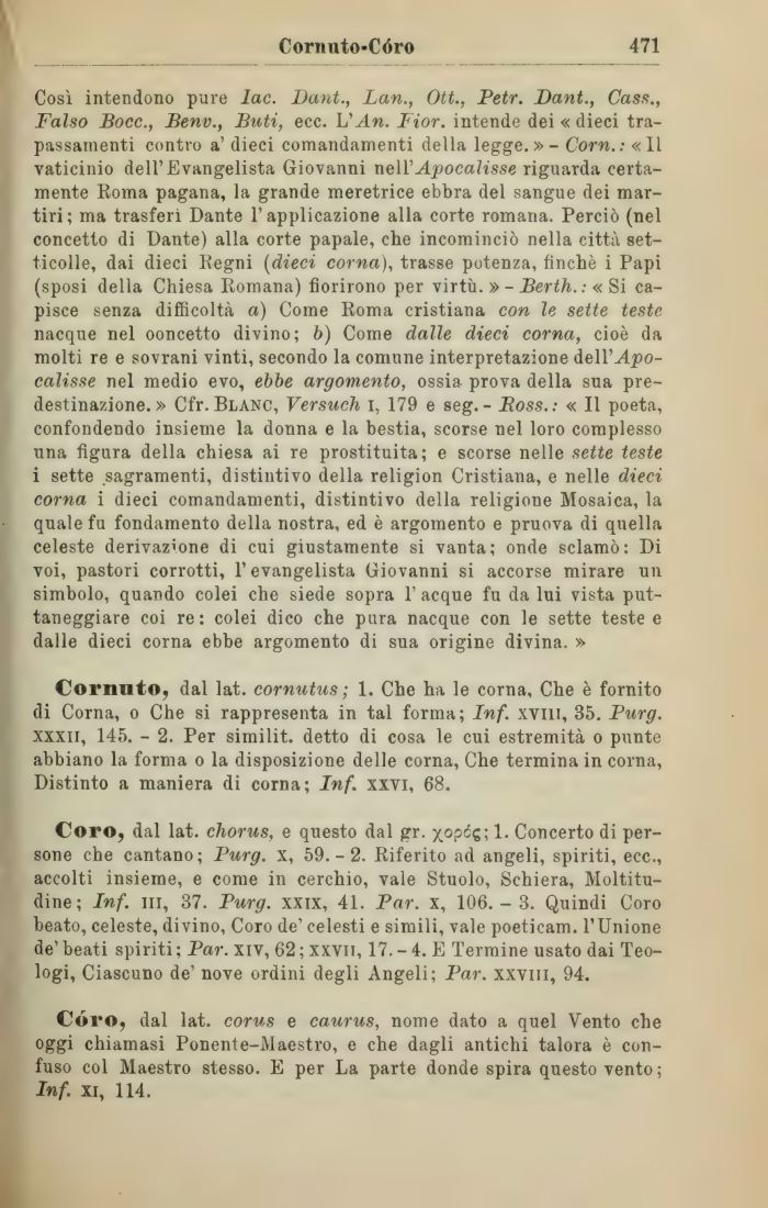 Cornnto, dal lat. comutus ; 1. Che ha le corna, Che è fornito di Corna, o Che si rappresenta in tal forma ; Inf. xvill, 35. Purg. xxxii, 145. - 2. Per similit. detto di cosa le cui estremità o punte abbiano la forma o la disposizione delle corna, Che termina in corna, Distinto a maniera di corna; Inf. xxvi, 68.
