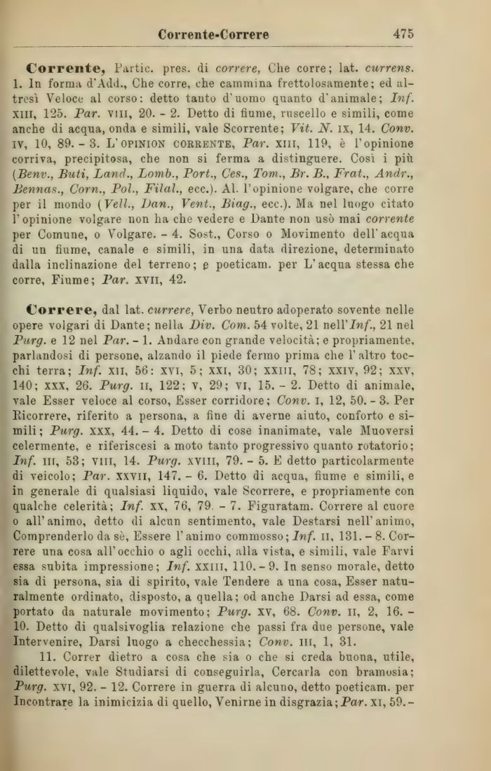 Correre, dal lat. currere, Verbo neutro adoperato sovente nelle opere volgari di Dante; nella Div. Com. 54 volte, 21 neWInf., 21 nel Purg. e 12 nel Par. - 1. Andare con grande velocità; e propriamente, parlandosi di persone, alzando il piede fermo prima che 1' altro tocchi terra; Inf. xn, 56: XVI, 5; XXI, 30; XXiil, 78; xxiv, 92; XXV, 140; xxx, 26. Purg. il, 122; v, 29; vi, 15. - 2. Detto di animale, vale Esser veloce al corso, Esser corridore; Conv. i, 12, 50.-3. Per Ricorrere, riferito a persona, a fine di averne aiuto, conforto e simili; Purg. xxx, 44.-4. Detto di cose inanimate, vale Muoversi celermente, e riferiscesi a moto tanto progressivo quanto rotatorio; Inf. ni, 53; Vili, 14. Purg. xvill, 79. - 5. E detto particolarmente di veicolo; Par. xxvii, 147.- 6. Detto di acqua, fiume e simili, e in generale di qualsiasi liquido, vale Scorrere, e propriamente con qualche celerità; Inf. xx, 76, 79. - 7. Figuratam. Correre al cuore o all'animo, detto di alcun sentimento, vale Destarsi nell'animo, Comprenderlo da sè, Essere l'animo commosso ; Inf. il, 131.-8. Correre una cosa all'occhio o agli occhi, alla vista, e simili, vale Farvi essa subita impressione; Inf. xxm, 110.-9. In senso morale, detto sia di persona, sia di spirito, vale Tendere a una cosa, Esser naturalmente ordinato, disposto, a quella; od anche Darsi ad essa, come portato da naturale movimento; Purg. XV, 68. Conv. il, 2, 16. -10. Detto di qualsivoglia relazione che passi fra due persone, vale Intervenire, Darsi luogo a checchessia; Conv. Ili, 1, 31.