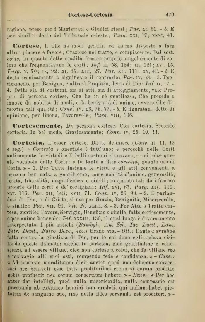 Cortesia, L'esser cortese. Dante definisce (Conv. it, 11, 43 e seg.) : « Cortesia e onestade è tutt' uno ; e perocché nelle Corti anticamente le virtudi e li belli costumi s'usavano,--si tolse questo vocabolo dalle Corti; e fu tanto a dire cortesia, quanto uso di Corte. » - 1. Per Tutte insieme le virtù e gli atti convenienti a persona ben nata, a gentiluomo; come nobiltà d'animo, generosità, lealtà, liberalità, magnificenza e simili; in quanto tali doti fossero proprie delle corti e de' cortigiani; Inf. xvi, 67. Purg. xiv, 110; xvi, 116. Par. xii, 143; xvn, 71. Conv. iv, 26, 90.- 2. E parlandosi di Dio, o di Cristo, si usò per Grazia, Benignità, Misericordia, o simile; Par. vii, 91. Vit. N. xliii, 8.-3. Per Atto o Tratto cortese, gentile; Favore, Servigio, Benefizio o simile, fatto cortesemente, o per animo benevolo; Inf. xxxiii, 150, il qual luogo è diversamente interpretato. I più antichi (Bambgl., An. Sei., Iac. Dant., Lan., Petr. Dant., Falso Bocc., ecc.) tirano via. -Ott.: Dante « avrebbe fatto contra la giustizia di Dio, per lo cui dono egli andava visitando questi dannati; sicché fu cortesia, cioè gratitudine e conoscenza ad essere villano, cioè non cortese a colui, che fu villano reo e malvagio alli suoi osti, rompendo fede e confidanza. »- Cass. : « Ad nostram moralitatem dicit auctor quod non debemus conversari nec benivoli esse istis proditoribus etiam si eorum proditio nobis profuerit nec eorum consortinm habere. » - Benv. : «Per hoc autor dat intelligi, quod nulla misericordia, nulla compassio est prsestanda ab extraneo homini tam crudeli, qui nullam habet pie-tatem de sanguine suo, imo nulla fides servanda est proditori. » -