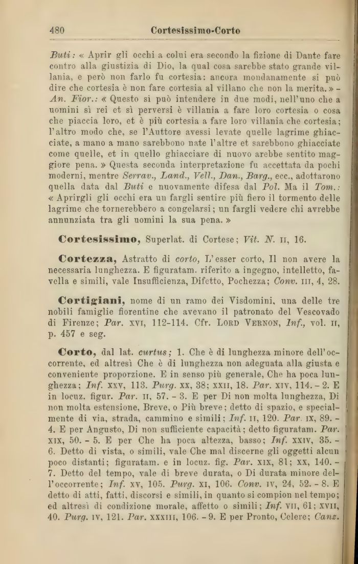 Corto, dal lat. curtus ; 1. Che è di lunghezza minore dell'occorrente, ed altresì Che è di lunghezza non adeguata alla giusta e conveniente proporzione. E in senso più generale, Che ha poca lunghezza; Inf. xxv, 113. Purg. xx, 38; xxii, 18. Par. xiv, 114.-2. E in locuz. figur. Par. n, 57. - 3. E per Di non molta lunghezza, Di non molta estensione, Breve, o Più breve; detto di spazio, e specialmente di via, strada, cammino e simili; Inf. IT, 120. Par. IX, 89. -4. E per Angusto, Di non sufficiente capacità; detto figuratam. Par. xix, 50.-5. E per Che ha poca altezza, basso; Inf. xxiv, 35.-