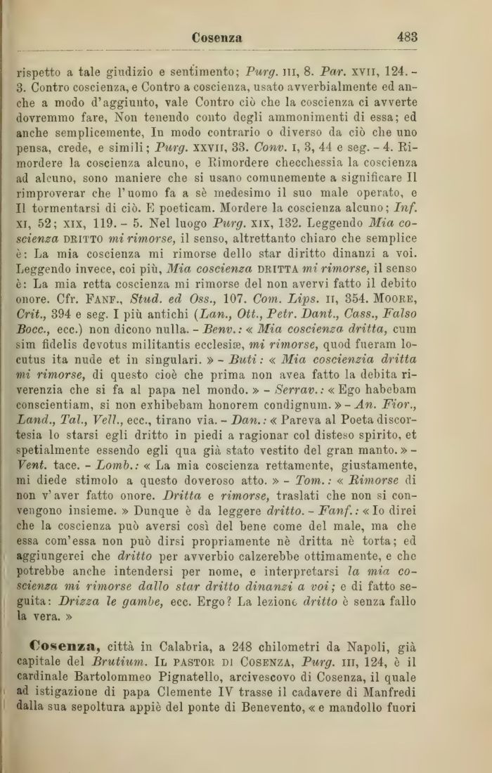 rispetto a tale giudizio e sentimento; Purg. hi, 8. Par. xvii, 124.-3. Contro coscienza, e Contro a coscienza, usato avverbialmente ed anche a modo d'aggiunto, vale Contro ciò che la coscienza ci avverte dovremmo fare, Non tenendo conto degli ammonimenti di essa; ed anche semplicemente, In modo contrario o diverso da ciò che uno pensa, crede, e simili ; Purg. xxvii, 33. Conv. i, 3, 44 e seg. - 4. Rimordere la coscienza alcuno, e Rimordere checchessia la coscienza ad alcuno, sono maniere che si usano comunemente a significare II rimproverar che l'uomo fa a sè medesimo il suo male operato, e Il tormentarsi di ciò. E poeticam. Mordere la coscienza alcuno; Inf. xi, 52; xix, 119. - 5. Nel luogo Purg. xix, 132. Leggendo Mia coscienza dritto mi rimorse, il senso, altrettanto chiaro che semplice è: La mia coscienza mi rimorse dello star diritto dinanzi a voi. Leggendo invece, coi più, Mia coscienza dritta mi rimorse, il senso è: La mia retta coscienza mi rimorse del non avervi fatto il debito onore. Cfr. Fanf., Stud. ed Oss., 107. Com. Lips. il, 354. Moore, Crit., 394 e seg. I più antichi (Lan., Ott., Petr. Dani., Cass., Falso Bocc., ecc.) non dicono nulla. - Benv.: « Mia coscienza, dritta, cura sim fidelis devotus militantis ecclesia, mi rimorse, quod fueram lo-cutus ita nude et in singulari. » - Buti : « Mia coscienzia dritta mi rimorse, di questo cioè che prima non avea fatto la debita ri-verenzia che si fa al papa nel mondo. » - Serrav. : « Ego habebam conscientiam, si non exhibebam honorem condignum. » - An. Fior., Land., Tal., Veli., ecc., tirano via. - Dan.: « Pareva al Poeta discortesia lo starsi egli dritto in piedi a ragionar col disteso spirito, et spetialmente essendo egli qua già stato vestito del gran manto. »-Vent. tace. - Lomb.: « La mia coscienza rettamente, giustamente, mi diede stimolo a questo doveroso atto. » - Tom. : « Bimorse di non v' aver fatto onore. Dritta e rimorse, traslati che non si convengono insieme. » Dunque è da leggere dritto. - Fanf'. : «Io direi che la coscienza può aversi così del bene come del male, ma che essa com'essa non può dirsi propriamente nè dritta nè torta; ed aggiungerei che dritto per avverbio calzerebbe ottimamente, e che potrebbe anche intendersi per nome, e interpretarsi la mia coscienza mi rimorse dallo star dritto dinanzi a voi; e di fatto seguita: Drizza le gambe, ecc. Ergo? La lezione dritto è senza fallo la vera. »
