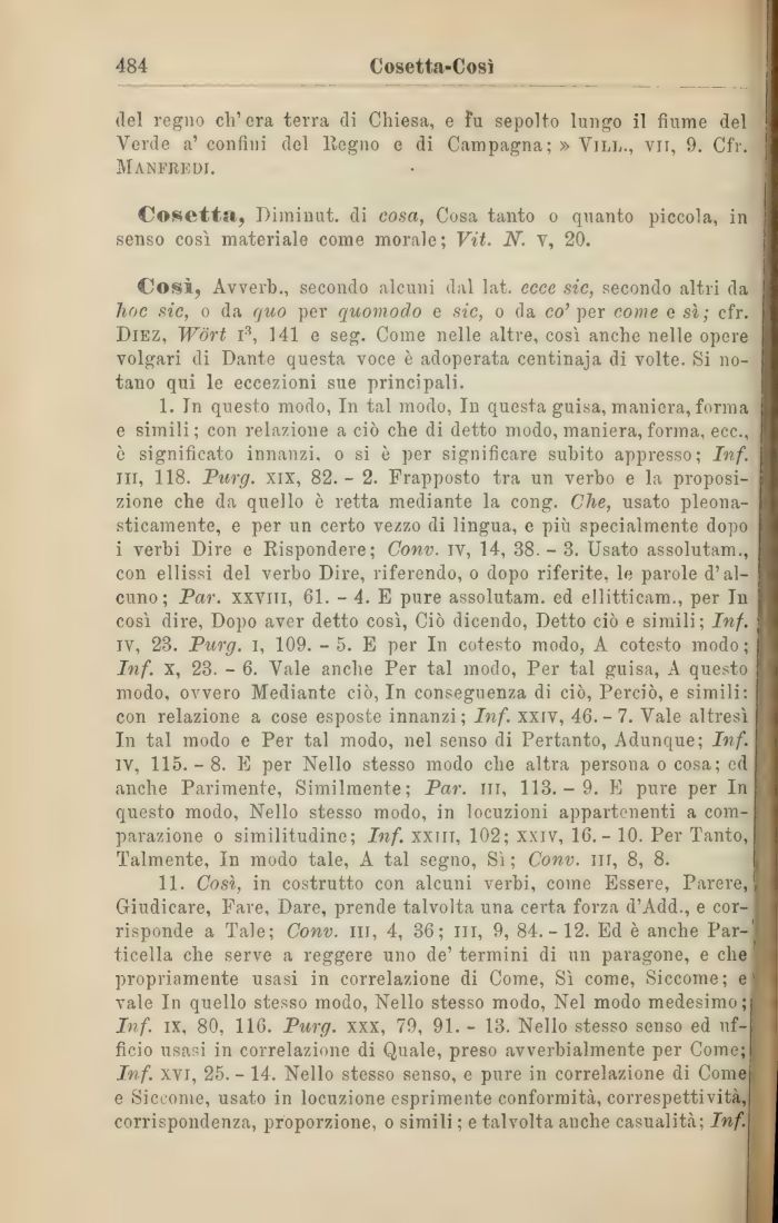 Così, Avverb., secondo alcuni dal lat. ecce sic, secondo altri da hoc sic, o da quo per quomodo e sic, o da co' per come e sì; cfr. Diez, Wòrt i3, 141 e seg. Come nelle altre, così anche nelle opere volgari di Dante questa voce è adoperata centinaja di volte. Si notano qui le eccezioni sue principali.
