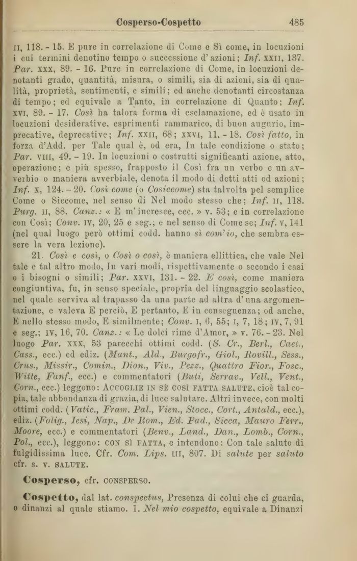 21. Così e così, o Così o così, è maniera ellittica, che vale Nel tale e tal altro modo, In vari modi, rispettivamente o secondo i casi o i bisogni o simili; Par. xxvi, 131. - 22. E così, come maniera congiuntiva, fu, in senso speciale, propria del linguaggio scolastico, nel quale serviva al trapasso da una parte ad altra d'una argomentazione, e valeva E perciò, E pertanto, E in conseguenza; od anche, E nello stesso modo, E similmente; Conv. i, 6, 55; i, 7, 18; iv, 7, 91 e seg.; IV, 16, 70. Cam.: « Le dolci rime d'Amor, » v. 76.-23. Nel luogo Par. xxx, 53 parecchi ottimi codd. (S. Cr., Beri., Caet., Cass., ecc.) ed ediz. (Mant., Aid., Burgofr., Gioì., Bovili., Sess., Crus., Missir., Comin., Dion., Viv., Pezz., Quattro Fior., Fosc., Witte, Fanf., ecc.) e commentatori (Buti, Serrav., Veli., Vent., Com., ecc.) leggono: Accoglie in sè così fatta salute, cioè tal copia, tale abbondanza di grazia, di luce salutare. Altri invece, con molti ottimi codd. ( Vatic., Fram. Pah, Vien., Stocc., Cort., Antald., ecc.), ediz. (Foìig., Iesi, Nctp., De Bom., Fd. Pad., Sicca, Mauro Ferr., Moore, ecc.) e commentatori (Benv., Land., Dan., Lomb., Com., Poi., ecc.), leggono: con sì eatta, e intendono: Con tale saluto di fulgidissima luce. Cfr. Com. Lips. in, 807. Di salute per saluto cfr. s. v. salute.