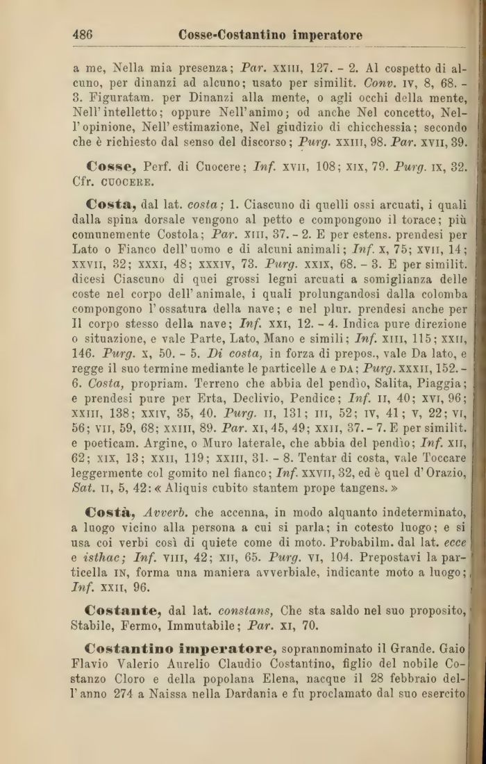 Costa, dal lat. costa; 1. Ciascuno di quelli ossi arcuati, i quali dalla spina dorsale vengono al petto e compongono il torace; più comunemente Costola; Par. xiii, 37.-2. E per estens. prendesi per Lato o Fianco dell'uomo e di alcuni animali; Inf. x, 75; xvii, 14; xxvii, 32; xxxi, 48; xxxiv, 73. Purg. xxix, 68.-3. E per similit. dicesi Ciascuno di quei grossi legni arcuati a somiglianza delle coste nel corpo dell' animale, i quali prolungandosi dalla colomba compongono 1' ossatura della nave ; e nel plur. prendesi anche pelli corpo stesso della nave; Inf. xxi, 12.-4. Indica pure direzione o situazione, e vale Parte, Lato, Mano e simili; Inf. xiii, 115; xxii, 146. Purg. x, 50. - 5. Di costa, in forza di prepos., vale Da lato, e regge il suo termine mediante le particelle a e da; Purg. xxxii, 152. -6. Costa, propriam. Terreno che abbia del pendìo, Salita, Piaggia; e prendesi pure per Erta, Declivio, Pendice; Inf. li, 40; xvi, 96; xxm, 138; xxiv, 35, 40. Purg. il, 131; in, 52; IV, 41; V, 22; vi, 56; vii, 59, 68; xxm, 89. Par. xi, 45, 49; xxii, 37.- 7. E per similit. e poeticam. Argine, o Muro laterale, che abbia del pendìo; Inf. xii, 62; xix, 13; xxii, 119; xxlli, 31. - 8. Tentar di costa, vale Toccare leggermente col gomito nel fianco; Inf. xxvii, 32, ed è quel d'Orazio, Sat. il, 5, 42: « Aliquis cubito stantem prope tangens. »
