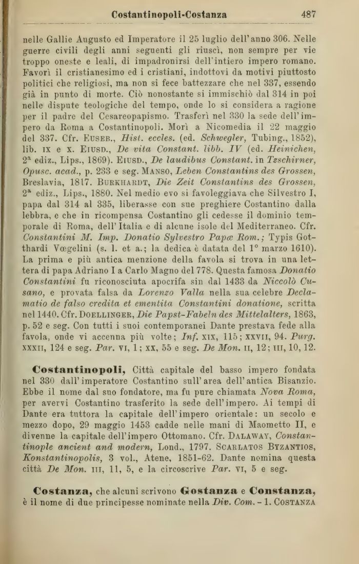 nelle Gallie Augusto ed Imperatore il 25 luglio dell'anno 306. Nelle guerre civili degli anni seguenti gli riuscì, non sempre per vie troppo oneste e leali, di impadronirsi dell'intiero impero romano. Favorì il cristianesimo ed i cristiani, indottovi da motivi piuttosto politici che religiosi, ma non si fece battezzare che nel 337, essendo già in punto di morte. Ciò nonostante si immischiò dal 314 in poi nelle dispute teologiche del tempo, onde lo si considera a ragione per il padre del Cesareopapismo. Trasferì nel 330 la sede dell'impero da Roma a Costantinopoli. Morì a Nicomedia il 22 maggio del 337. Cfr. Euseb., Hist. eccles. (ed. Schwegler, Tubing., 1852), lib. ix e x. Eluso., De vita Constant, libò. IV (ed. Heinichen, 2a ediz., Lips., 1869). Eiusd., De laudibus Constant, in Tzschirner, Opusc. acad., p. 233 e seg. Manso, Leben Constantins des Grossen, Breslavia, 1817. Bukkiiaiìdt, Die Zeit Constantins des Grossen, 2a ediz., Lips., 1880. Nel medio evo si favoleggiava che Silvestro I, papa dal 314 al 335, liberasse con sue preghiere Costantino dalla lebbra, e che in ricompensa Costantino gli cedesse il dominio temporale di Roma, dell'Italia e di alcune isole del Mediterraneo. Cfr. Constantini M. Imp. Donatio Sylvestro Papa; Rom. ; Typis Got-thardi Vcegelini (s. 1. et a.; la dedica è datata del 1° marzo 1610). La prima e più antica menzione della favola si trova in una lettera di papa Adriano I a Carlo Magno del 778. Questa famosa Donatio Constantini fu riconosciuta apocrifa sin dal 1433 da Niccolò Cusano, e provata falsa da Lorenzo Valla nella sua celebre Declamano de falso eredita et ementita Constantini donatione, scritta nel 1440. Cfr. Doellinger, Die Papst-Fabeln des Mittelalters, 1863, p. 52 e seg. Con tutti i suoi contemporanei Dante prestava fede alla favola, onde vi accenna più volte; Inf. xix, 115; xxvii, 94. Purg. xxxii, 124 e seg. Par. vi, 1 ; xx, 55 e seg. De Mon. n, 12; ni, 10,12. ![]() |