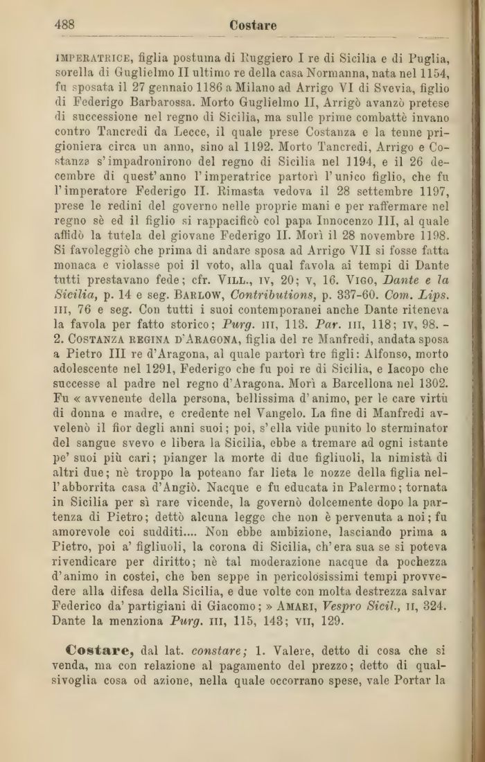 imperatrice, figlia postuma di Ruggiero I re di Sicilia e di Puglia, sorella di Guglielmo II ultimo re della casa Normanna, nata nel 1154, fu sposata il 27 gennaio 1186 a Milano ad Arrigo VI di Svevia, figlio di Federigo Barbarossa. Morto Guglielmo II, Arrigo avanzò pretese di successione nel regno di Sicilia, ma sulle prime combattè invano contro Tancredi da Lecce, il quale prese Costanza e la tenne prigioniera circa un anno, sino al 1192. Morto Tancredi, Arrigo e Costanza s'impadronirono del regno di Sicilia nel 1194, e il 26 de-cembre di quest'anno l'imperatrice partorì l'unico figlio, che fu l'imperatore Federigo II. Rimasta vedova il 28 settembre 1197, prese le redini del governo nelle proprie mani e per raffermare nel regno sè ed il figlio si rappacificò col papa Innocenzo III, al quale affidò la tutela del giovane Federigo II. Morì il 28 novembre 1198. Si favoleggiò che prima di andare sposa ad Arrigo VII si fosse fatta monaca e violasse poi il voto, alla qual favola ai tempi di Dante tutti prestavano fede; cfr. Vill., iv, 20; v, 16. Vigo, Dante e la Sicilia, p. 14 e seg. Barlow, Contributions, p. 337-60. Com. Lips. in, 76 e seg. Con tutti i suoi contemporanei anche Dante riteneva la favola per fatto storico; Purg. ni, 113. Par. in, 118; ìv, 98.-2. Costanza regina d'Aragona, figlia del re Manfredi, andata sposa a Pietro III re d'Aragona, al quale partorì tre figli: Alfonso, morto adolescente nel 1291, Federigo che fu poi re di Sicilia, e Iacopo che successe al padre nel regno d'Aragona. Morì a Barcellona nel 1302. Fu « avvenente della persona, bellissima d'animo, per le care virtù di donna e madre, e credente nel Vangelo. La fine di Manfredi avvelenò il fior degli anni suoi; poi, s'ella vide punito lo sterminator del sangue svevo e libera la Sicilia, ebbe a tremare ad ogni istante pe' suoi più cari; pianger la morte di due figliuoli, la nimistà di altri due; nè troppo la poteano far lieta le nozze della figlia nel-l'abborrita casa d'Angiò. Nacque e fu educata in Palermo; tornata in Sicilia per sì rare vicende, la governò dolcemente dopo la partenza di Pietro; dettò alcuna legge che non è pervenuta a noi; fu amorevole coi sudditi.... Non ebbe ambizione, lasciando prima a Pietro, poi a' figliuoli, la corona di Sicilia, ch'era sua se si poteva rivendicare per diritto; nè tal moderazione nacque da pochezza d'animo in costei, che ben seppe in pericolósissimi tempi provvedere alla difesa della Sicilia, e due volte con molta destrezza salvar Federico da' partigiani di Giacomo; » Amari, Vespro Sicih, il, 324. Dante la menziona Purg. ni, 115, 143; vii, 129.