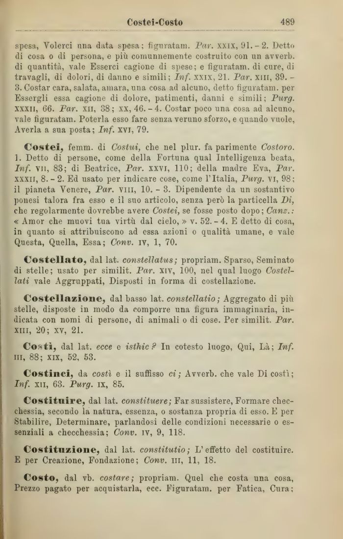 spesa, Volerci una data spesa; figuratali]. Par. xxix, 91.-2. Detto di cosa o di persona, e più comunnemente costruito con un avverb. di quantità, vale Esserci cagione di spese; e figuratam. di cure, di travagli, di dolori, di danno e simili; Inf. xxix, 21. Par. xill, 39. -8. Costar cara, salata, amara, una cosa ad alcuno, detto figuratam. per Essergli essa cagione di dolore, patimenti, danni e simili; Purg. xxxii, 66. Par. xn, 88; xx, 46.-4. Costar poco una cosa ad alcuno, vale figuratam. Poterla esso fare senza veruno sforzo, e quando vuole, Averla a sua posta; Inf. xvj, 79.