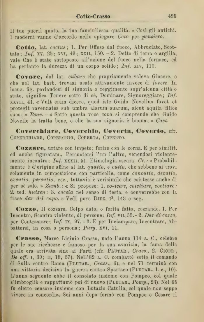 Cozzare, urtare con impeto; ferire con le corna. E per similit. ed anche figuratam., Percuotersi l'un l'altro, venendosi violentemente incontro; Inf. xxxii, 51. Etimologia oscura. ^..-«Probabilmente è d'origine alfine al lat. quatio, e cutio, che sebbene si trovi solamente in composizione con particelle, come concutio, decutio, excutio, percutio, ecc., tuttavia è verisimile che esistesse anche di per sè solo. » Zamb.: « Si propose: 1. co-icere, coictiare, codiare: 2. ted. ~hutzen : 3. coccia nel senso di testa, e converrebbe con la frase dar del capo. » Vedi pure Diez, i3, 143 e seg.