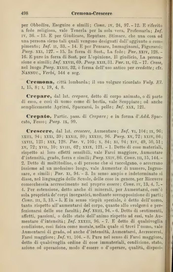 Crescere, dal lat. crescere, Aumentare; Inf. vi, 104; ix, 96; xxiii, 94; xxxi, 39; xxxn, 80; xxxiii, 96. Purg. xv, 72; xxiv, 86; xxvii, 123; xxx, 128. Par. v, 105; x, 84; xi, 94; xiv, 49, 50,51; xv, 72; xvii, 10; xvm, 62; xxix, 121. - 1. Detto di cose materiali, rispetto ai loro effetti sensibili, vale Farsi maggiore, Aumentare d'intensità, grado, forza e simili; Purg. xxiv, 86. Conv. in, 15, 144. -