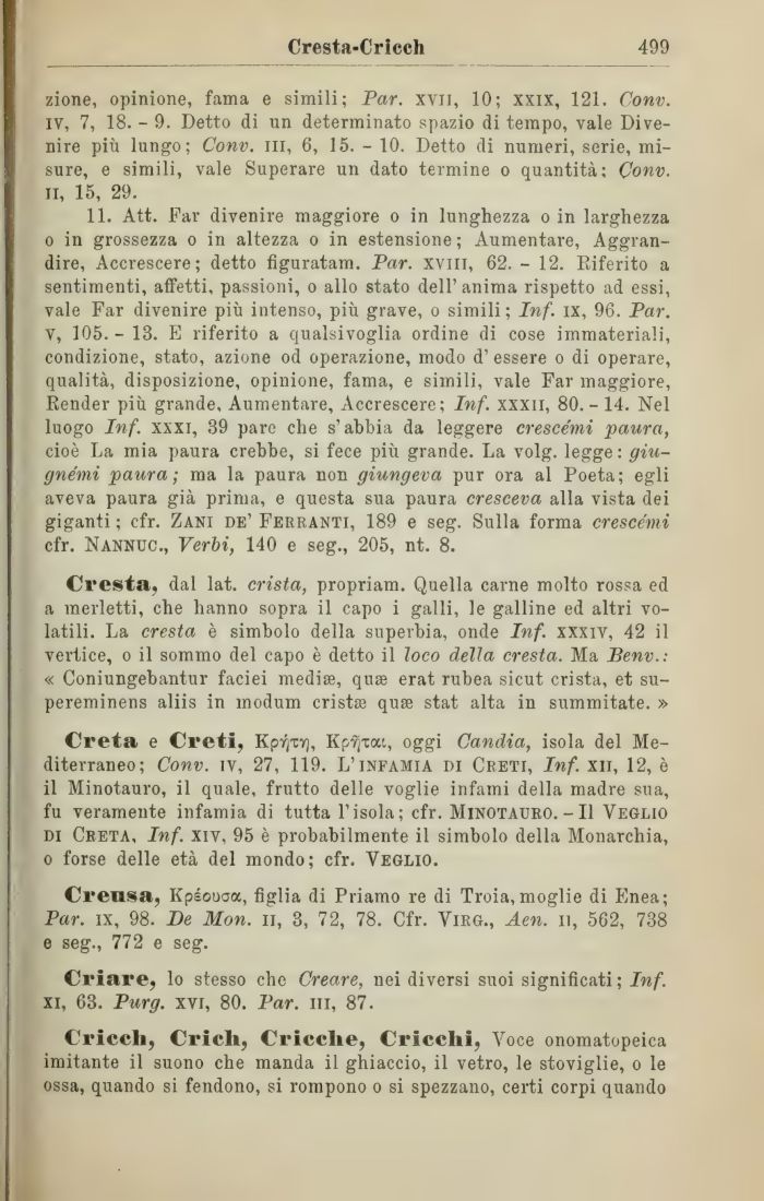 Creta e Creti, KpVjTy], Kpvjxoci, oggi Candia, isola del Mediterraneo; Conv. iv, 27, 119. L'infamia di Creti, Inf. xn, 12, è il Minotauro, il quale, frutto delle voglie infami della madre sua, fu veramente infamia di tutta l'isola; cfr. Minotauro. - Il Veglio di Creta, Inf. xiv, 95 è probabilmente il simbolo della Monarchia, o forse delle età del mondo; cfr. Veglio.