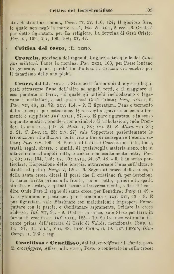 Croce, dal lat. crux ; 1. Strumento formato di due grossi legni, posti attraverso l'uno dell'altro ad angoli retti, e il maggiore di essi piantato in terra; sul quale gli antichi inchiodavano o legavano i malfattori, e sul quale patė Gesų Cristo; Purg. xxxiii, 6. Par. vii, 40; xi, 72; xxv, 114. - 2. E figuratam., Pena o tormento della croce; e per estensione, Qualsivoglia gravissima pena o tormento o supplizio; Inf. xxxiii, 87. - 3. E pure figuratam., e in senso alquanto mistico, prendesi come simbolo di tribolazioni, onde Prendere la sua croce (cfr. 8. Matt. x, 38; xvi, 24. S. Marc, vili, 34; x, 21. S. Lue. ix, 23; xiv, 27) vale Sopportare pazientemente le tribolazioni ed afflizioni della vita a fine di conseguire l'eterna salute; Par. xiv, 106. - 4. Per similit. dicesi Croce a due liste, linee, tratti, segni, sbarre, o simili, di qualsivoglia materia sieno, che si attraversino ad angoli retti, o anche non esattamente retti; Par. i, 39; xiv, 104, 122; xv, 20; xvm, 34, 37, 48. - 5. E in senso particolare, Disposizione delle braccia, attraversate 1'una sull'altra, e strette al petto; Purg. v, 126.- 6. Segno di croce, della croce, o della santa croce, dicesi II porsi che il cristiano fa per devozione la mano diritta prima alla fronte, poi al petto, quindi alla spalla sinistra e destra, e quindi passarla trasversalmente, a fine di benedire. Onde Fare il segno di santa croce, per Benedire; Purg. n, 49.-7. Figuratam. e poeticam. per Tormentare ; Inf. xvi, 43. - 8. E pur figuratam. vale Biasimare con maledizioni e improperj, Perseguitare con le parole, o Condannare aspramente, Gridare la croce addosso; Inf. vii, 91. - 9. Disteso in croce, vale Steso per terra in forma di crocifisso; Inf. xxiii, 125. - 10. Sulla croce veduta in Firenze prima dell'entrata di Carlo di Valois, menzionata Conv. li, 14, 131, cfr. Vill., viii, 48. Dino Comp., ii, 19. Del Lungo, Dino Comp. il, 193 e seg.
