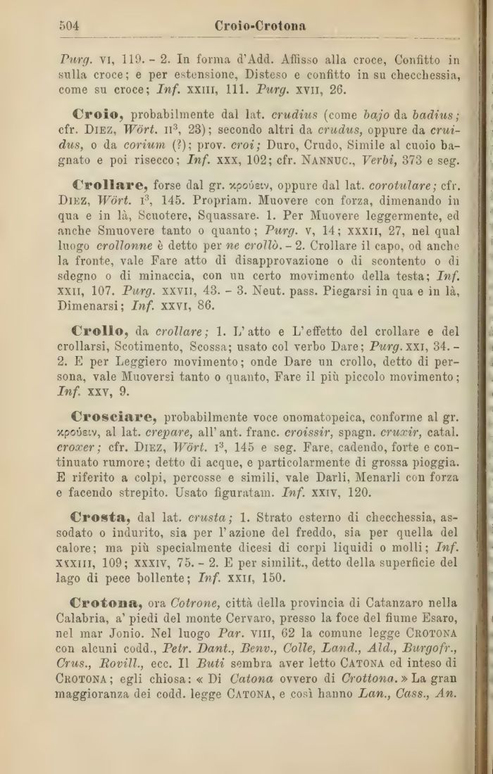 Crotoìia, ora Cotrone, città della provincia di Catanzaro nella Calabria, a' piedi del monte Cervaro, presso la foce del fiume Esaro, nel mar Jonio. Nel luogo Par. vili, 62 la comune legge Crotona con alcuni codd., Petr. Dant., Benv., Colle, Land., Aid., Burgofr., Crus., Bovili., ecc. Il Buti sembra aver letto Catona ed inteso di Crotona ; egli chiosa : « Di Catona ovvero di Crottona. » La gran maggioranza dei codd. legge Catona, e così hanno Lati., Cass., An.