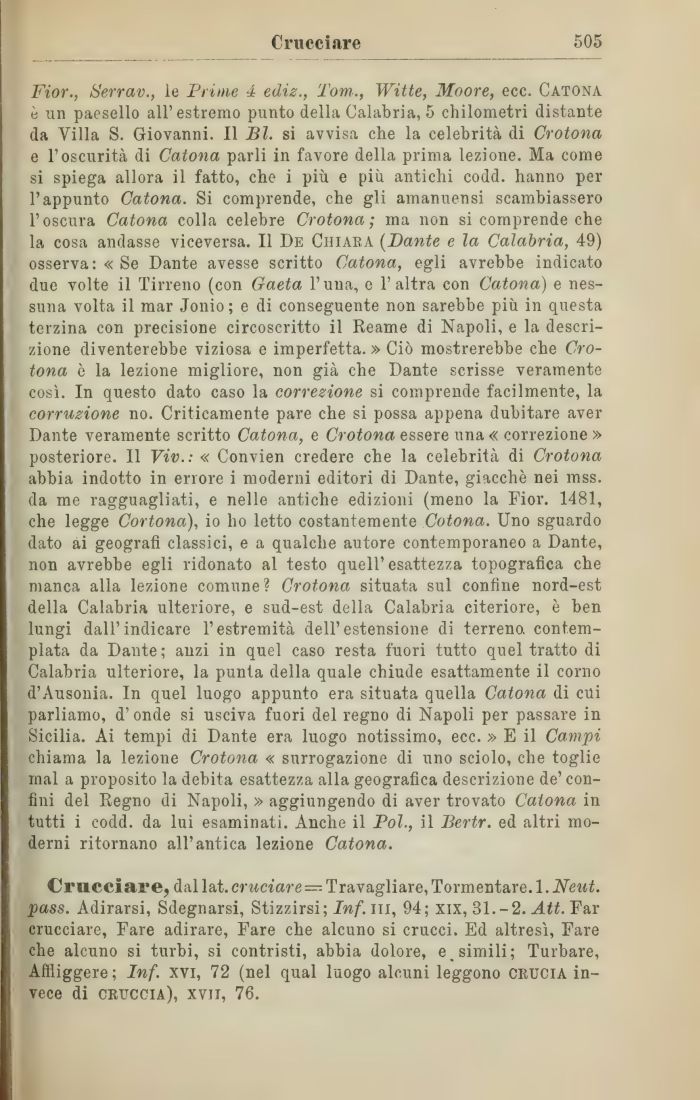 Fior., Serrav., le Prime 4 ediz., Tom.., Witte, Moore, ecc. Catona è un paesello all'estremo punto della Calabria, 5 chilometri distante da Villa S. Giovanni. Il Bl. si avvisa che la celebrità di Crotona e l'oscurità di Cafona parli in favore della prima lezione. Ma come si spiega allora il fatto, che i più e più antichi codd. hanno per l'appunto Catona. Si comprende, che gli amanuensi scambiassero l'oscura Catona colla celebre Crotona; ma non si comprende che la cosa andasse viceversa. Il De Chiara (Dante e la Calabria, 49) osserva: «Se Dante avesse scritto Catona, egli avrebbe indicato due volte il Tirreno (con Gaeta V una, e 1' altra con Catona) e nessuna volta il mar Jonio ; e di conseguente non sarebbe più in questa terzina con precisione circoscritto il Reame di Napoli, e la descrizione diventerebbe viziosa e imperfetta. » Ciò mostrerebbe che Crotona ò la lezione migliore, non già che Dante scrisse veramente così. In questo dato caso la correzione si comprende facilmente, la corruzione no. Criticamente pare che si possa appena dubitare aver Dante veramente scritto Catona, e Crotona essere una « correzione » posteriore. Il Viv.: « Convien credere che la celebrità di Crotona abbia indotto in errore i moderni editori di Dante, giacché nei mss. da me ragguagliati, e nelle antiche edizioni (meno la Fior. 1481, che legge Cortona), io ho letto costantemente Cotona. Uno sguardo dato ai geografi classici, e a qualche autore contemporaneo a Dante, non avrebbe egli ridonato al testo quell'esattezza topografica che manca alla lezione comune? Crotona situata sul confine nord-est della Calabria ulteriore, e sud-est della Calabria citeriore, è ben lungi dall'indicare l'estremità dell'estensione di terreno, contemplata da Dante; anzi in quel caso resta fuori tutto quel tratto di Calabria ulteriore, la punta della quale chiude esattamente il corno d'Ausonia. In quel luogo appunto era situata quella Catona di cui parliamo, d'onde si usciva fuori del regno di Napoli per passare in Sicilia. Ai tempi di Dante era luogo notissimo, ecc. » E il Campi chiama la lezione Crotona « surrogazione di uno sciolo, che toglie mal a proposito la debita esattezza alla geografica descrizione de' confini del Regno di Napoli, » aggiungendo di aver trovato Catona in tutti i codd. da lui esaminati. Anche il Poi., il Bertr. ed altri moderni ritornano all'antica lezione Catona.