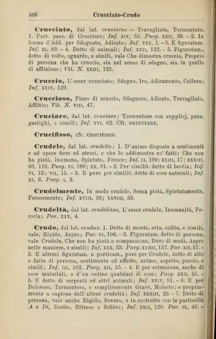 Crudo, dal lat. crudus. 1. Detto di monte, erta, salita, e simili, vale, Ripido, Aspro; Par. xi, 106.-2. Figuratam. detto di persona, vale Crudele, Che non ha pietà o compassione, Duro di modi, Aspro nelle maniere, e simili ; Inf. xxx, 33. Purg. xxxii, 157. Par. xii, 57. -3. E altresì figuratam. e poeticam., pure per Crudele, detto di atto o fatto di persona, sentimento od affetto, animo, aspetto, parole, e simili; Inf. in, 102. Purg. xii, 55. - 4. E per estensione, anche di cose materiali, o d'un ordine qualsiasi di cose; Purg. xxn, 55. -5. E detto di serpenti ed altri animali; Inf. xxiv, 91.-6. E per Doloroso, Tormentoso, o semplicemente Grave, Molesto; e propriamente a cagione dell' altrui crudeltà ; Inf. xxxin, 20. - 7. Detto di persona, vale anche Rigido, Severo, e in costrutto con le particelle A e Di, Restio, Ritroso o Schivo; Inf. xxn, 120. Par. ix, 48. -