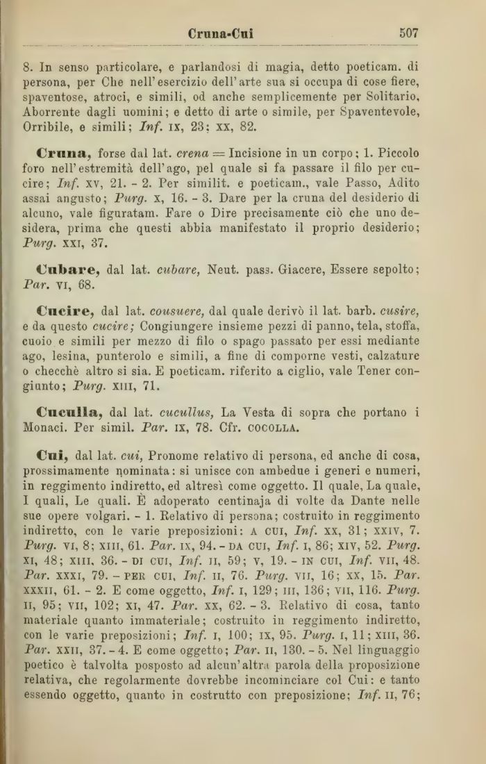 1 quali, Le quali. È adoperato centinaja di volte da Dante nelle sue opere volgari. - 1. Eelativo di persona; costruito in reggimento indiretto, con le varie preposizioni: a cui, Inf. xx, 31; xxiv, 7. Purg. vi, 8; xiii, 61. Par. ix, 94. - da cui, Inf. i, 86; xiv, 52. Purg. xi, 48; xiii, 36. - di cui, Inf. n, 59; v, 19. - in cui, Inf. vii, 48. Par. xxxi, 79. - per cui, Inf. n, 76. Purg. vii, 16; xx, 15. Par. xxxii, 61. - 2. E come oggetto, Inf. i, 129; in, 136; vii, 116. Purg. li, 95; vn, 102; xi, 47. Par. xx, 62.-3. Eelativo di cosa, tanto materiale quanto immateriale; costruito in reggimento indiretto, con le varie preposizioni; Inf. i, 100; ix, 95. Purg. i, 11; xiii, 36. Par. xxii, 37.-4. E come oggetto; Par. n, 130.-5. Nel linguaggio poetico è talvolta posposto ad alcun'altra parola della proposizione relativa, che regolarmente dovrebbe incominciare col Cui : e tanto essendo oggetto, quanto in costrutto con preposizione; Inf. n, 76;