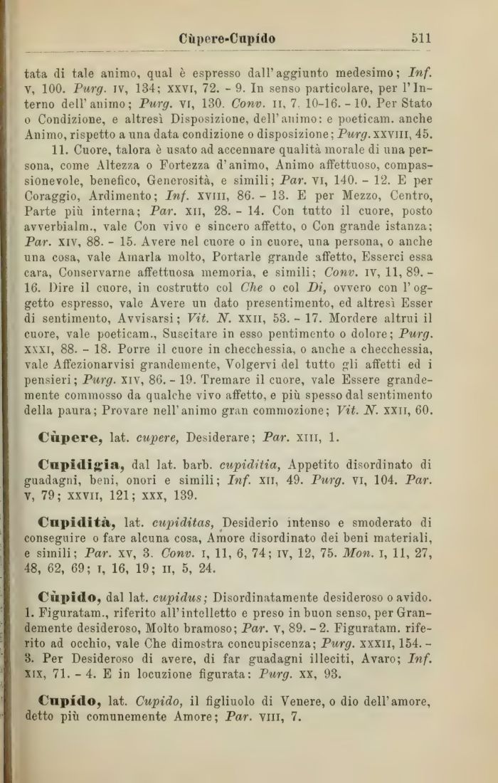 Cnpidità, lat. cupiditas, Desiderio intenso e smoderato di conseguire o fare alcuna cosa, Amore disordinato dei beni materiali, e simili; Par. xv, 3. Conv. i, 11, 6, 74; ìv, 12, 75. Mon. i, 11, 27, 48, 62, 69; t, 16, 19; il, 5, 24.