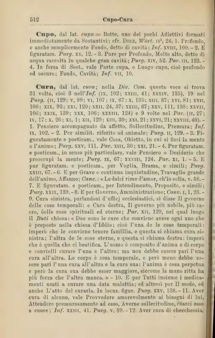 Cura, dal lat. cura; nella Div. Com. questa voce si trova 31 volta, cioè 3 nel!'Inf. (ix, 102; xxm, 41; xxxiv, 135), 19 nel Purg. (il, 129; v, 89; vi, 107; ix, 67; x, 135; xiii, 87; xvi, 81; xvit, 100; xix, 93; xxi, 120; xxii, 24, 37; xxm, 67; xxv, 111, 138; xxvil, 106; xxix, 139; xxx, 106; xxxiii, 124) e 9 volte nel Par. (n, 27; iv, 17; x, 26; xi, 1; xii, 129; Sin, 30; xxi, 21 ; xxvi, 21; xxviii, 40).-1. Pensiero accompagnato da affetto, Sollecitudine, Premura; Inf. ix, 102. - 2. Per similit. riferito ad animale; Purg. ir, 129.-3. Figuratamente e poeticam., vale Cosa, Obietto, in cui si fissi la mente o l'animo; Purg. xxv, 111. Par. xiii, 30; xxi, 21. - 4. Pur figuratam. e poeticam., in senso più particolare, vale Pensiero o Desiderio che preoccupi la mente; Purg. ix, 67; xxxm, 124. Par. xi, 1.-5. E pur figuratam. e poeticam., per Voglia, Brama, e simili; Purg. xxm, 67.-6. E per Grave e continua inquietudine, Travaglio grande dell'animo, Affanno; Cam. : « Le dolci rime d'amor, ch'io solia, v. 58.-7. E figuratam. e poeticam., per Intendimento, Proposito, e simili; Purg. xxix, 139.-8. E per Governo, Amministrazione; Conv. i, 1, 23.-9. Cura sinistra, parlandosi d'uflìcj ecclesiastici, si disse II governo delle cose temporali; e Cura destra, Il governo più nobile, più sacro, delle cose spirituali ed eterne; Par. xii, 129, nel qual luogo il Buti chiosa: « Due sono le cure che conviene avere ogni uno che è preposto nella chiesa d'Iddio; cioè l'una de le cose temporali: imperò che le conviene tenere famillia, e questa si chiama cura sinistra; l'altra de le cose eterne, e questa si chiama destra: imperò che è quella che ci beatifica. L'uomo è composito d'anima e di corpo e convielli curare l'una e l'altro; ma non debbe essere pari l'una cura all'altra. Lo corpo è cosa temporale, e però meno debbe essere pari l'una cura all'altra e la cura sua: l'anima è cosa perpetua e però la cura sua debbe esser maggiore, siccome la mano ritta ha più forza che l'altra manca. » - 10. E per Tutti insieme i medicamenti usati a curare una data malattia; ed altresì per II modo, ed anche L'atto del curarla. In locuz. figur. Purg. xxv, 138.- 11. Aver cura di alcuno, vale Provvedere amorevolmente ai bisogni di lui, Attendere premurosamente ad esso, Averne sollecitudine, Starci esso a cuore; Inf. xxm, 41. Purg. v, 89.-12. Aver cura di checchessia,