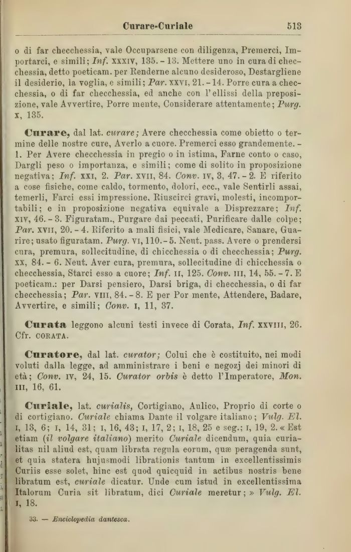 Cnrare, dal lat. curare; Avere checchessia come obietto o termine delle nostre cure, Averlo a cuore. Premerci esso grandemente. -1. Per Avere checchessia in pregio o in istima, Farne conto o caso, Dargli peso o importanza, e simili; come di solito in proposizione negativa; Inf. xxi, 2. Par. xvn, 84. Conv. iv, 3, 47.-2. E riferito a cose fisiche, come caldo, tormento, dolori, ecc., vale Sentirli assai, temerli, Farci essi impressione. Riuscirci gravi, molesti, incomportabili; e in proposizione negativa equivale a Disprezzare; Inf. xiv, 46. -3. Figuratam., Purgare dai peccati, Purificare dalle colpe; Par. xvn, 20. - 4. Riferito a mali fisici, vale Medicare, Sanare, Guarire; usato figuratam. Purg. vi, 110.-5. Neut. pass. Avere o prendersi cura, premura, sollecitudine, di chicchessia o di checchessia; Purg. xx, 84. - 6. Neut. Aver cura, premura, sollecitudine di chicchessia o checchessia, Starci esso a cuore; Inf. n, 125. Conv. in, 14, 55.-7. E poeticam.: per Darsi pensiero, Darsi briga, di checchessia, o di far checchessia; Par. vili, 84.-8. E per Por mente, Attendere, Badare, Avvertire, e simili; Conv. l, 11, 37.