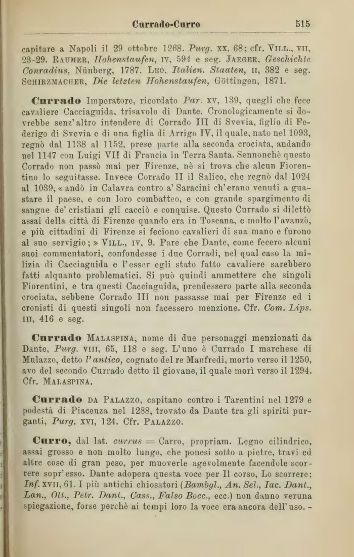 Currado Imperatore, ricordato Par. xv, 139, quegli che fece cavaliere Cacciaguida, trisavolo di Dante. Cronologicamente si dovrebbe senz'altro intendere di Corrado III di Svevia, figlio di Federigo di Svevia e di una figlia di Arrigo IV, il quale, nato nel 1093, regnò dal 1138 al 1152, prese parte alla seconda crociata, andando nel 1147 con Luigi VII di Francia in Terra Santa. Sennonché questo Corrado non passò mai per Firenze, nè si trova che alcun Fiorentino lo seguitasse. Invece Corrado II il Salico, che regnò dal 1024 al 1039, «andò in Calavra contro a' Saracini ch'erano venuti a guastare il paese, e con loro combatteo, e con grande spargimento di sangue de' cristiani gli cacciò e conquise. Questo Currado si dilettò assai della città di Firenze quando era in Toscana, e molto l'avanzò, e più cittadini di Firenze si feciono cavalieri di sua mano e furono al suo servigio ; » Vill., ìv, 9. Pare che Dante, come fecero alcuni suoi commentatori, confondesse i due Corradi, nel qual caso la milizia di Cacciaguida e l'esser egli stato fatto cavaliere sarebbero fatti alquanto problematici. Si può quindi ammettere che singoli Fiorentini, e tra questi Cacciaguida, prendessero parte alla seconda crociata, sebbene Corrado III non passasse mai per Firenze ed i cronisti di questi singoli non facessero menzione. Cfr. Com. Lips. in, 416 e seg.
