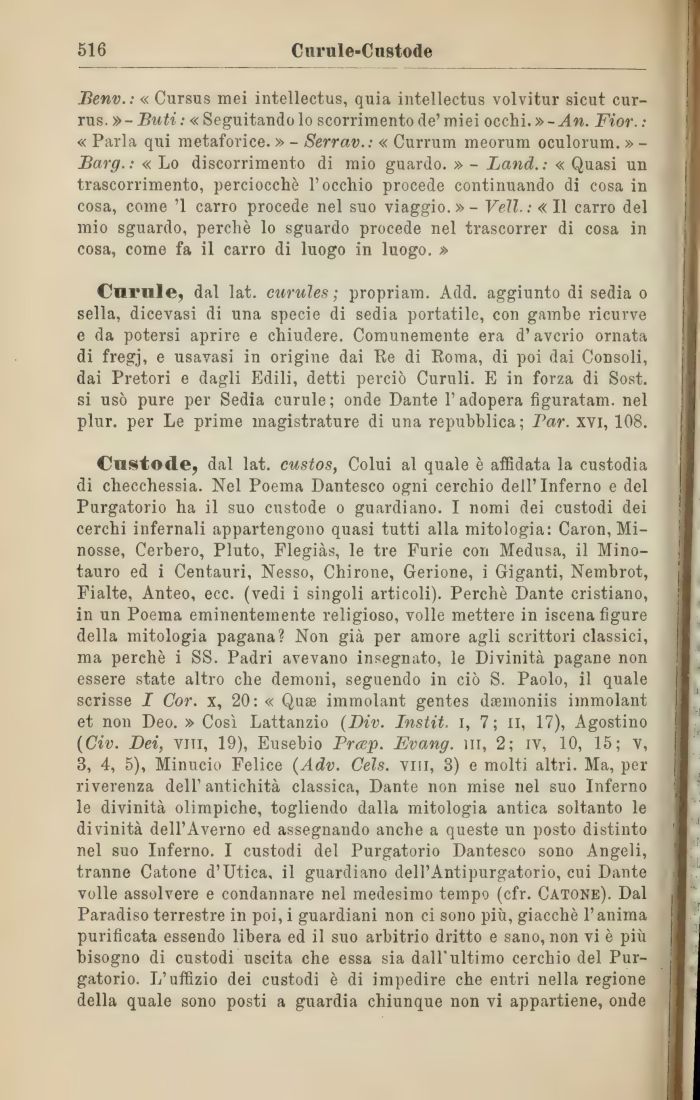Custode, dal lat. custos, Colui al quale è affidata la custodia di checchessia. Nel Poema Dantesco ogni cerchio dell'Inferno e del Purgatorio ha il suo custode o guardiano. I nomi dei custodi dei cerchi infernali appartengono quasi tutti alla mitologia: Caron, Minosse, Cerbero, Pluto, Flegiàs, le tre Furie con Medusa, il Minotauro ed i Centauri, Nesso, Chirone, Gerione, i Giganti, Nembrot, Fialte, Anteo, ecc. (vedi i singoli articoli). Perchè Dante cristiano, in un Poema eminentemente religioso, volle mettere in iscena figure della mitologia pagana? Non già per amore agli scrittori classici, ma perchè i SS. Padri avevano insegnato, le Divinità pagane non essere state altro che demoni, seguendo in ciò S. Paolo, il quale scrisse I Cor. x, 20: « Quae immolant gentes dsemoniis iinmolant et non Deo. » Così Lattanzio (Div. Instit. i, 7; II, 17), Agostino (Civ. Dei, viti, 19), Eusebio Prcep. Evang. ni, 2; iv, 10, 15; v, 3, 4, 5), Minucio Felice (Adv. Cels. vili, 3) e molti altri. Ma, per riverenza dell' antichità classica, Dante non mise nel suo Inferno le divinità olimpiche, togliendo dalla mitologia antica soltanto le divinità dell'Averno ed assegnando anche a queste un posto distinto nel suo Inferno. I custodi del Purgatorio Dantesco sono Angeli, tranne Catone d'Utica, il guardiano dell'Antipurgatorio, cui Dante volle assolvere e condannare nel medesimo tempo (cfr. Catone). Dal Paradiso terrestre in poi, i guardiani non ci sono più, giacché l'anima purificata essendo libera ed il suo arbitrio dritto e sano, non vi è più bisogno di custodi uscita che essa sia dall'ultimo cerchio del Purgatorio. L'uffizio dei custodi è di impedire che entri nella regione della quale sono posti a guardia chiunque non vi appartiene, onde