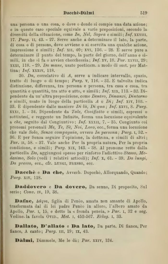 30. Da, correlativo di A, serve a indicare intervallo, spazio, tratto di luogo o di tempo; Purg. v, 116. -31. E talvolta indica distinzione, differenza, tra persona e persona, tra cosa e cosa, tra quantitą e quantitą, tra atto e atto, e simili; Inf. xix, 113. - 32. Dipendente da un'altra preposizione, come Dentro, Dinanzi, Dintorno e simili, usato in luogo della particella A o Di; Inf. xiv, 103. -33. E dipendente dalle maniere Di lą, Di qua ; Inf. xxvi, 8. Purg. xxxi, 1. - 34. Dipendente da Tale, Cosiffatto e simili, espressi o sottintesi, e reggente un Infinito, forma una locuzione equivalente a che, seguito dal Congiuntivo; Inf. xxxn, 7.-35. Congiunto coi pronomi personali Me, Te, Sč, Noi, Loro, ecc., forma una locuzione che vale Solo, Senza compagnia, ovvero In persona ; Purg. i, 52.-36. E per Senza seguire l'opinione, la dottrina, e simili di altri; Par. n, 58. - 37. Vale anche Per la propria natura, Per la propria condizione, e simili; Purg. xix, 143. - 38. Al pronome retto dalla particella Da, aggiungesi spesso per rinforzo l'adiettivo Stesso, Medesimo, Solo (vedi i relativi articoli); Inf. x, 61. - 39. Da lungi, Da presso, ecc., cfr. lungi, presso, ecc.
