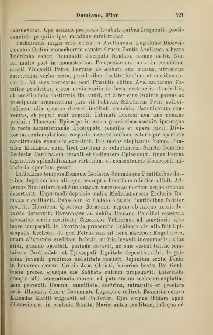 Perficiend® magis vit® causa in Avellanensi Eugubina? Diocesis ccenobis Ordini monacliorum sanct® Crucis Fontis Avellana}, a beato Ludulpho sancti Romualdi discipulo fundato, nomen dedit. Non ita multo post in monasterium Pomposianum, mox in ccenobium sancti Vincentii Petrae Pertus® ab Abbate suo missus, utrumque asceterium verbo sacro, prseclaribus institutionibus et moribus ex-coluit. Ad suos revocatus post Prsesidis obitus Avellanitarum Fa-mili® prseficitur, quam novis variis in locis exstructis domiciliis, et sanctissimis institutis ita auxit, ut alter ejus Ordinis parens ac prsecipuum ornamentum jure sit habitus. Salutarem Petri sollici-tudinem alia quoque diversi instituti coenobia, Canonicorum con-ventus, et populi sunt experti. Urbinati Diocesi non uno nomine profuit; Theuzoni Episcopo in causa gravissima assedit, ipsumque in recte administrando Episcopatu Consilio et opera juvit. Divi-noi-um contemplatione, corporis macerationibus, ceterisque spectat® sanctimoni® exemplis excelluit. His motos Stephanus Nonus, Pon-tifex Maximus, eum, licet invitum et reluctantem, Sanct® Romana) Ecclesia Cardinalein creavit et Ostiensem Episcopum. Quas Petrus dignitates splendidissimis virtutibus et consentaneis Episcopali mi-nisterio operibus gessit.