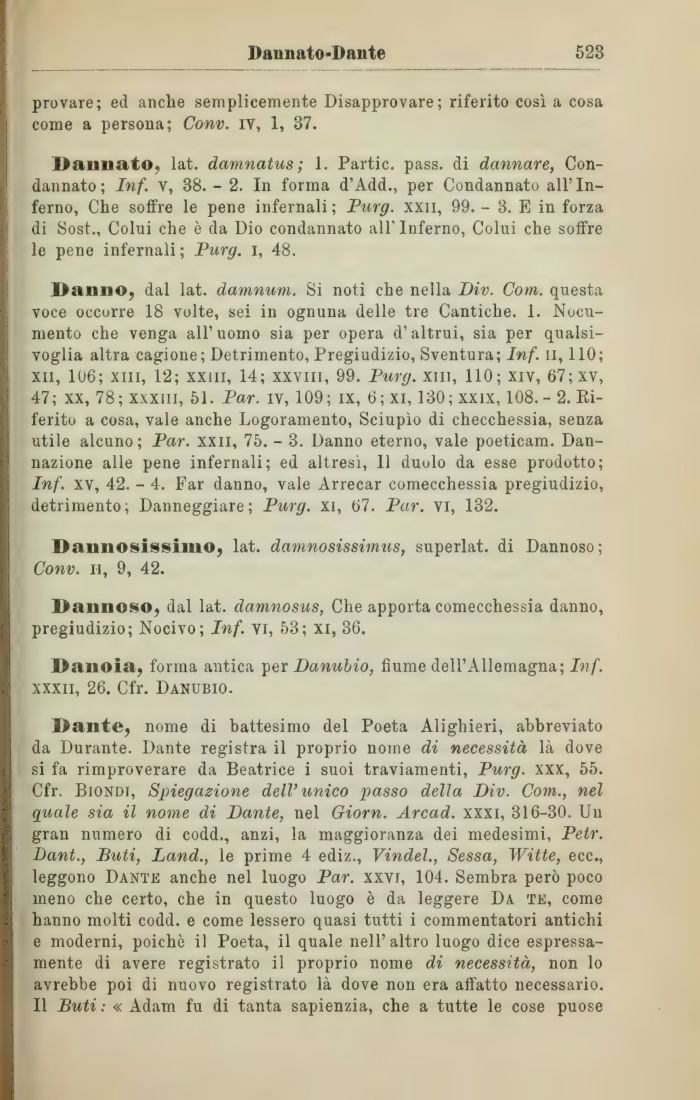 Danno, dal lat. damnum. Si noti che nella Div. Com. questa voce occorre 18 volte, sei in ognuna delle tre Cantiche. 1. Nocumento che venga all'uomo sia per opera d'altrui, sia per qualsivoglia altra cagione; Detrimento, Pregiudizio, Sventura; Inf. il, 110; xii, 106; xiii, 12; xxiii, 14; xxviii, 99. Purg. xm, 110; xiv, 67; xv, 47; xx, 78; xxxiii, 51. Par. iv, 109; ix, 6; xi, 130; xxix, 108.- 2. Riferito a cosa, vale anche Logoramento, Sciupìo di checchessia, senza utile alcuno; Par. xxii, 75. - 3. Danno eterno, vale poeticam. Dannazione alle pene infernali; ed altresì, 11 duolo da esse prodotto; Inf. xv, 42. - 4. Far danno, vale Arrecar comecchessia pregiudizio, detrimento; Danneggiare; Purg. xi, 67. Par. vi, 132.