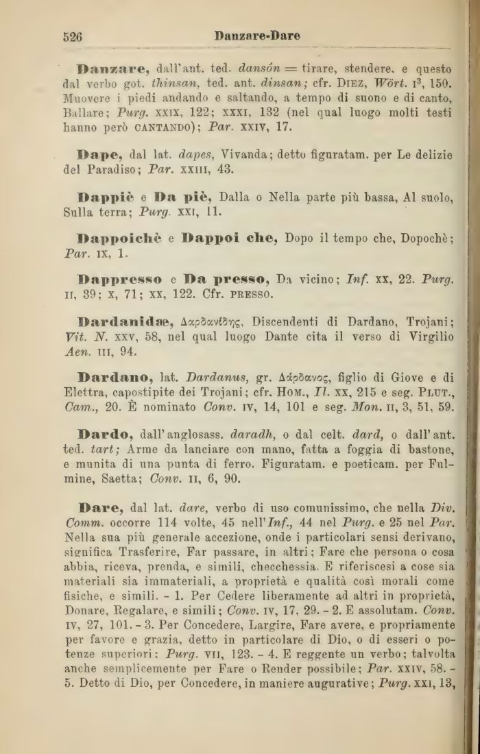 Dare, dal lat. dare, verbo di uso comunissimo, che nella Div. Comm. occorre 114 volte, 45 nell'Inf., 44 nel Purg. e 25 nel Par. Nella sua più generale accezione, onde i particolari sensi derivano, significa Trasferire, Far passare, in altri; Fare che persona o cosa abbia, riceva, prenda, e simili, checchessia. E riferiscesi a cose sia materiali sia immateriali, a proprietà e qualità così morali come fisiche, e simili. - 1. Per Cedere liberamente ad altri in proprietà, Donare, Regalare, e simili ; Conv. iv, 17, 29. - 2. E assolutam. Conv. iv, 27, 101.-3. Per Concedere, Largire, Fare avere, e propriamente per favore e grazia, detto in particolare di Dio, o di esseri o potenze superiori: Purg. vii, 123. - 4. E reggente un verbo; talvolta anche semplicemente per Fare o Render possibile; Par. xxiv, 58.-5. Detto di Dio, per Concedere, in maniere augurative; Purg. xxi, 13,