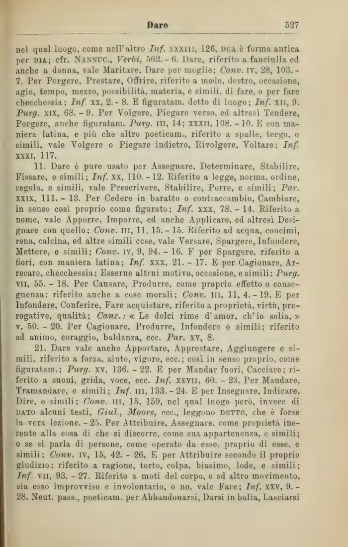 21. Dare vale anche Apportare, Apprestare, Aggiungere e simili, riferito a forza, aiuto, vigore, ecc.; così in senso proprio, come figuratam.; Purg. xv, 136. - 22. E per Mandar fuori, Cacciare; riferito a suoni, grida, voce, ecc. Inf. xxvii, 60. - 23. Per Mandare, Tramandare, e simili; Inf. in, 133.-24. E per Insegnare, Indicare, Dire, e simili; Conv. ni, 15, 159, nel qual luogo però, invece di dato alcuni testi, Giul., Moore, ecc., leggono detto, che è forse la vera lezione. - 25. Per Attribuire, Assegnare, come proprietà inerente alla cosa di che si discorre, come sua appartenenza, e simili; o se si parla di persone, come operato da esse, proprio di esse, e simili; Conv. iv, 15, 42. - 26. E per Attribuire secondo il proprio giudizio; riferito a ragione, torto, colpa, biasimo, lode, e simili; Inf. vii, 93. - 27. Riferito a moti del corpo, o ad altro movimento, sia esso improvviso e involontario, o no, vale Fare; Inf. xxv, 9.-28. Neut. pass., poeticam. per Abbandonarsi, Darsi in balìa, Lasciarsi