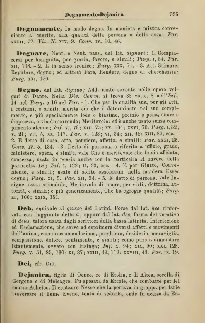 Degno, dal lat. dignus; Add. usato sovente nelle opere volgari di Dante. Nella Div. Comm. si trova 38 volte, 8 xieWInf., 14 nel Purg. e 16 nel Par. - 1. Che per le qualità sue, per gli atti, i costumi, e simili, merita ciò che è determinato nel suo compimento, e più specialmente lode o biasimo, premio o pena, onore o disprezzo, e via discorrendo; Meritevole; ed è anche usato senza compimento alcuno; Inf. vi, 79; xiii, 75; xx, 104; xxvi, 70. Purg. 1,32; v, 21; vii, 5, xx, 117. Par. v, 128; vi, 34; xn, 42; xiii, 82, ecc.-2. E detto di cosa, atto, pensiero, affetto, e simili; Par. xxxi, 23. Conv. iv, 5, 134. - 3. Detto di persona, e riferito a ufficio, grado, ministero, opera, e simili, vale Che è meritevole che le sia affidata, concessa; usato in poesia anche con la particella A invece della particella Di ; Inf. i, 122 ; il, 33, ecc. - 4. E per Giusto, Conveniente, e simili; usato di solito assolutam. nella maniera Esser degno ; Purg. xi, 5. Par. xn, 34. - 5. E detto di persona, vale Insigne, assai stimabile, Meritevole di onore, per virtù, dottrina, autorità, e simili; e più genericamente, Che ha egregia qualità; Purg. in, 100; xxix, 151.