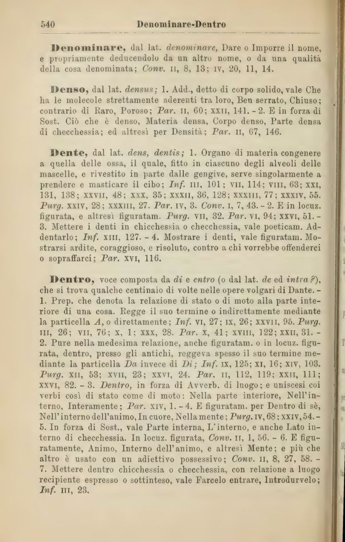 Dente, dal lat. dens, dentis ; 1. Organo di materia congenere a quella delle ossa, il quale, fitto in ciascuno degli alveoli delle mascelle, e rivestito in parte dalle gengive, serve singolarmente a prendere e masticare il cibo; Inf. ni, 101; vii, 114; vili, 63; xxi, 131, 138; xxvn, 48; xxx, 35; xxxii, 36, 128; xxxiii, 77; xxxiv, 55. Purg. xxiv, 28; xxxm, 27. Par. ìv, 3. Conv. I, 7, 43. - 2. E in locuz. figurata, e altresì figuratam. Purg. Vii, 32. Par. vi, 94; xxvi, 51.-3. Mettere i denti in chicchessia o checchessia, vale poeticam. Addentarlo; Inf. xiii, 127. -4. Mostrare i denti, vale figuratam. Mostrarsi ardite, coraggioso, e risoluto, contro a chi vorrebbe offenderci o sopraffarci; Par. xvi, 116.