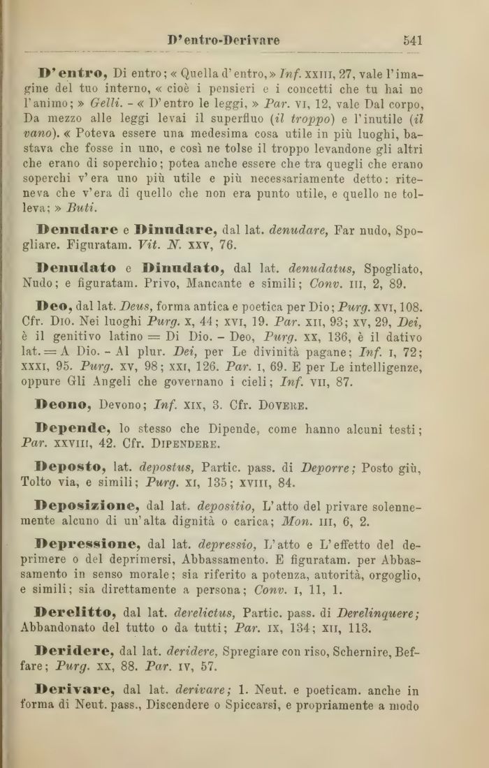 Deo, dal lat. Deus, forma antica e poetica per Dio; Purg. xvi, 108. Cfr. Dio. Nei luoghi Purg. x, 44; xvi, 19. Par. xii, 93; xv, 29, Dei, è il genitivo latino = Di Dio. - Deo, Purg. xx, 136, è il dativo lat. = A Dio. - Al plur. Dei, per Le divinità pagane; Inf. i, 72; xxxi, 95. Purg. xv, 98; xxi, 126. Par. i, 69. E per Le intelligenze, oppure Gli Angeli che governano i cieli; Inf. vii, 87.